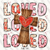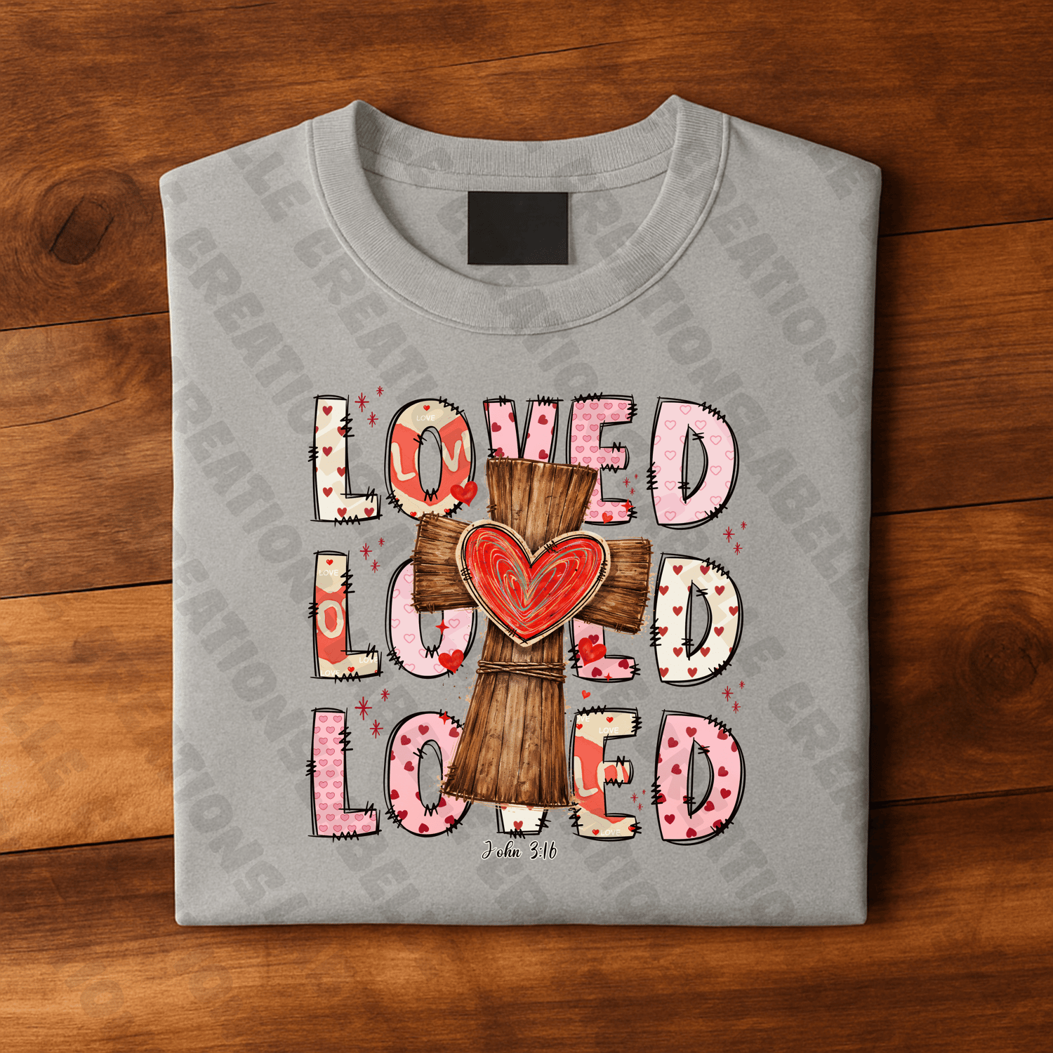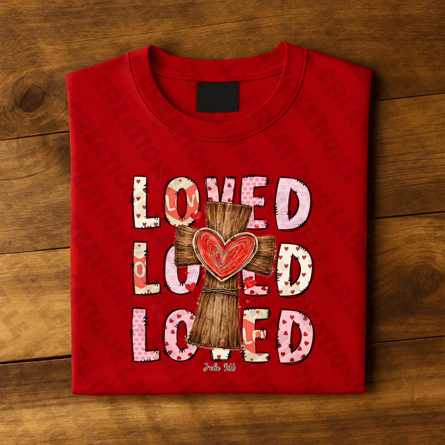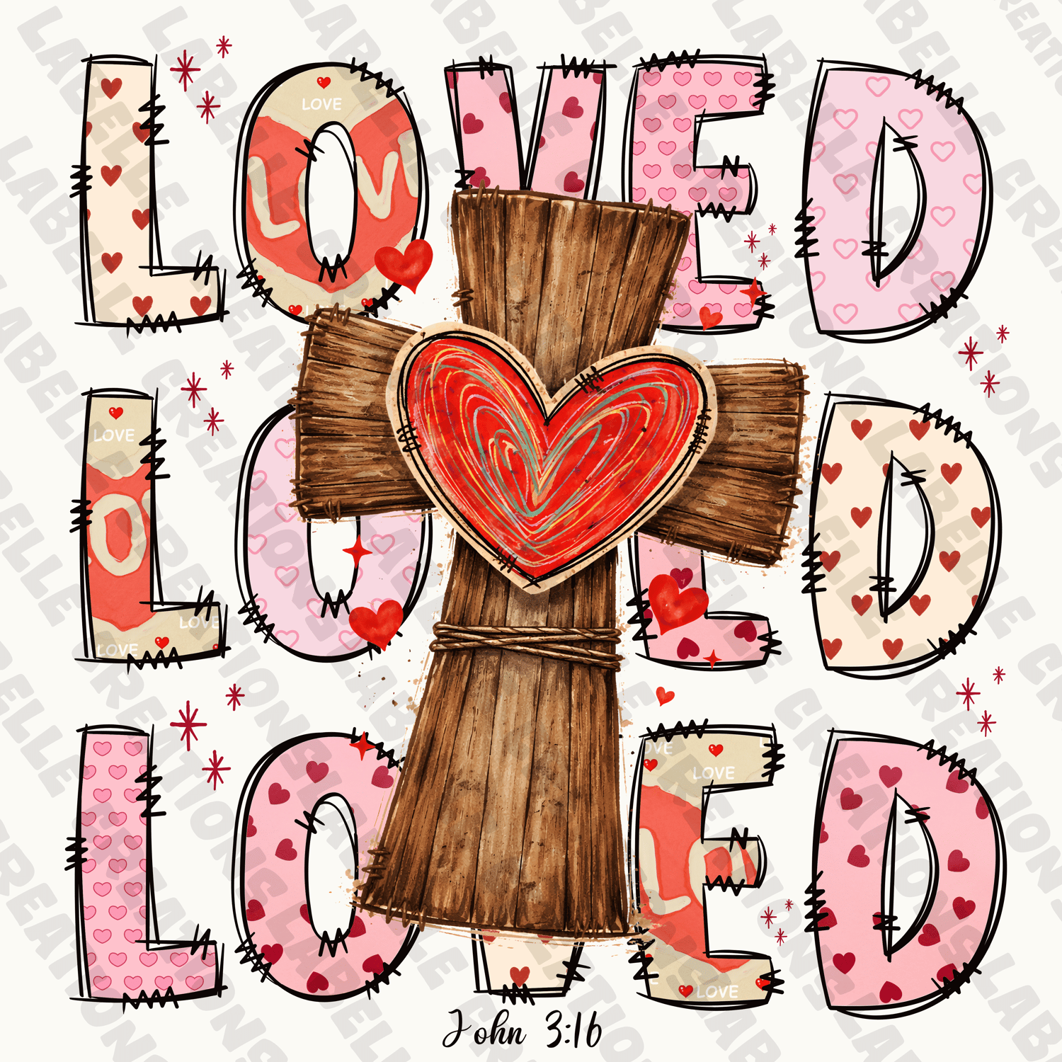 This heartfelt digital design beautifully combines faith and love with bold, playful lettering and a rustic wooden cross featuring a vibrant hand-painted heart at the center. The repeating word “LOVED” surrounds the cross, reinforced by the powerful scripture reference John 3:16, creating a meaningful reminder of God’s unconditional love.