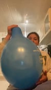 Stella from Starloons blows to pop a blue Subway print balloon with a loud bang