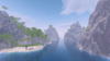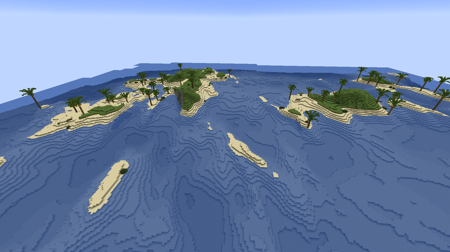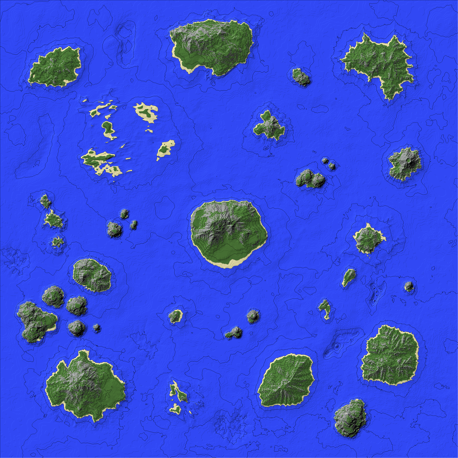 A sea of various mountainous, cliffed, sandy, and lush islands. The islands are filled with a wide variety of trees and shrubbery to bring them to life. There's an island in the middle with flat space for a spawn. This map works great for adventure maps, RPGs, builds, etc.