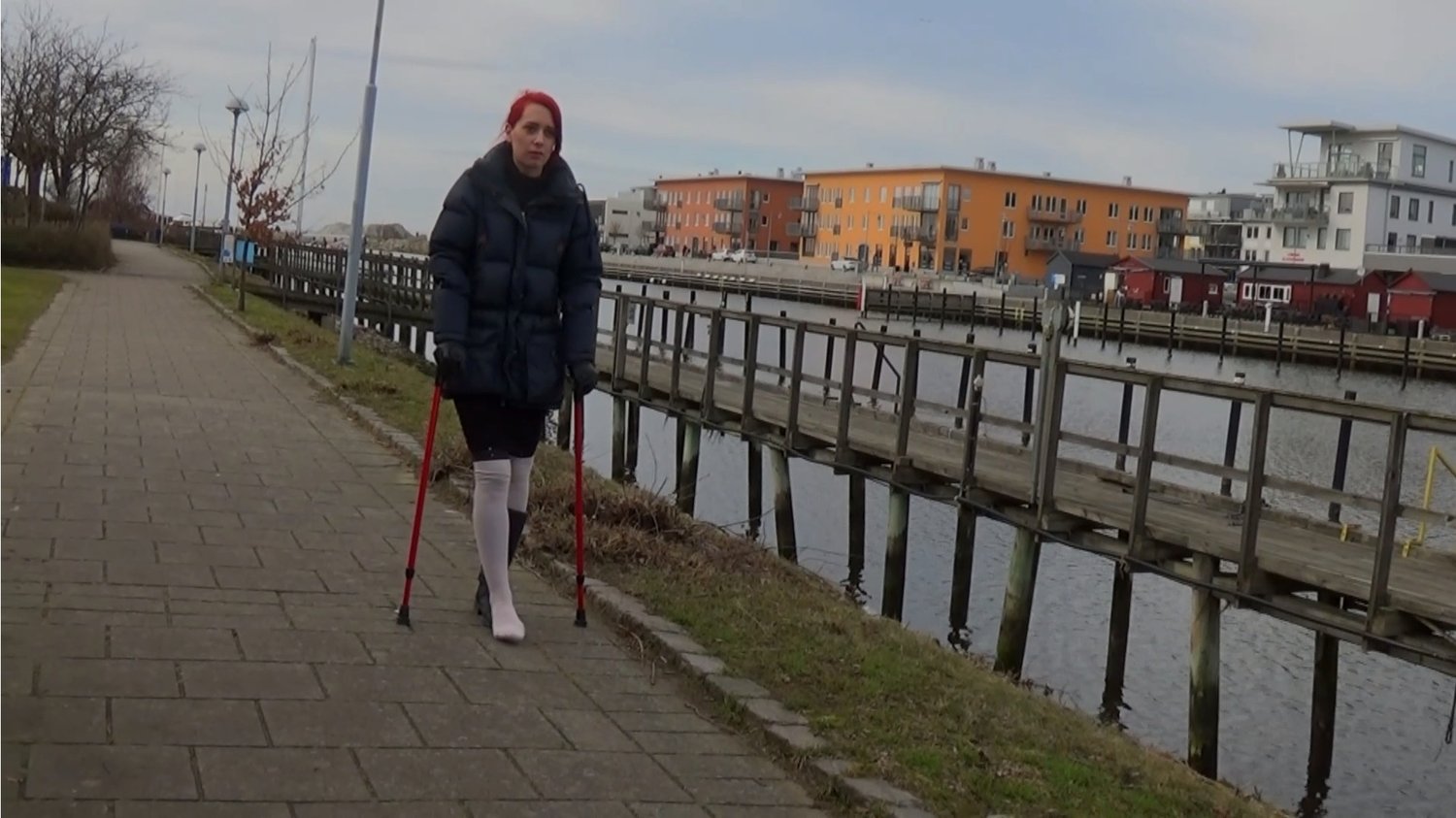 Sunshine loves sitting by the water and listen to the ducks when they swim by once in a while, today is such a day. She is bored at home with her sprained foot and decided to put on nice white tights as she crutches all the way down there, which is quite far. But after some time, she finally made it down. She even manages to leave her crutches aside to hop on the last part as well, out to the bridge where she sat peacefully.