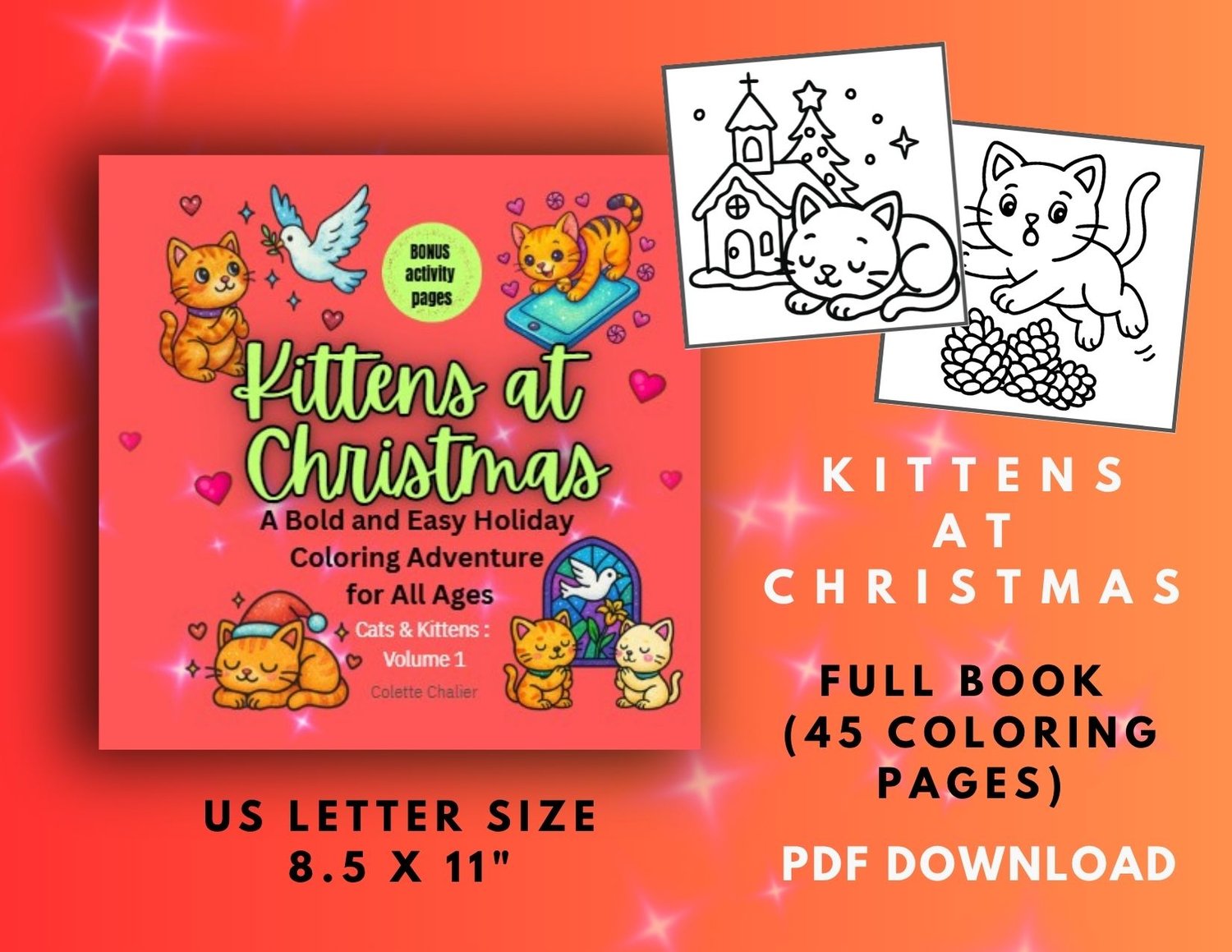Celebrate the season with 45 cute and festive kitten illustrations! Created by a teacher, each page features bold, easy-to-color outlines—perfect for kids and fun for all ages. From kittens in stockings to playful cats with ornaments and Santa hats, this book is filled with holiday cheer and cozy charm. Includes unique Christian themed designs.