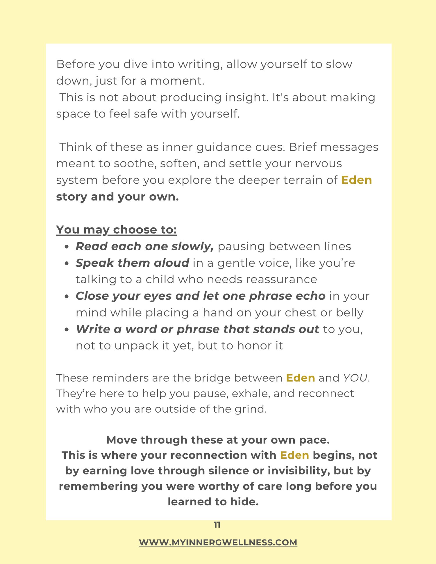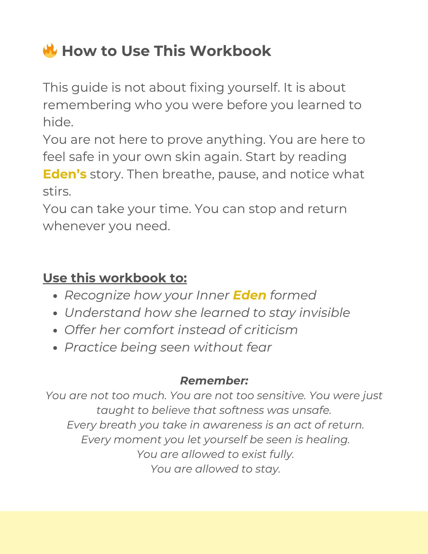Inside, you’ll explore Eden’s story, uncover the moments that shaped your fear of being seen, and learn evidence-based tools to create safety in visibility. Through reflection, somatic grounding, and self-compassion practices, you’ll begin to understand that your sensitivity was never weakness, it was wisdom waiting to be reclaimed.