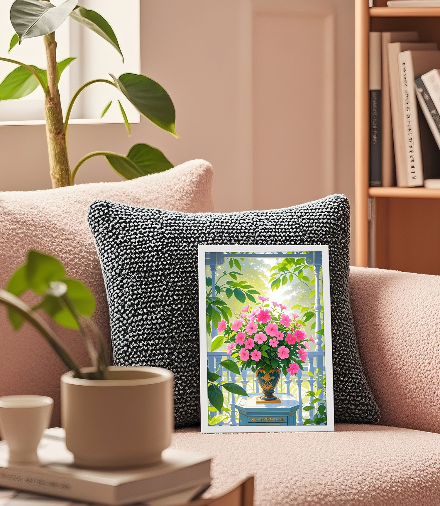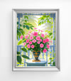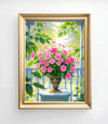 This artwork beautifully balances vibrant flowers with the gentle play of natural light.