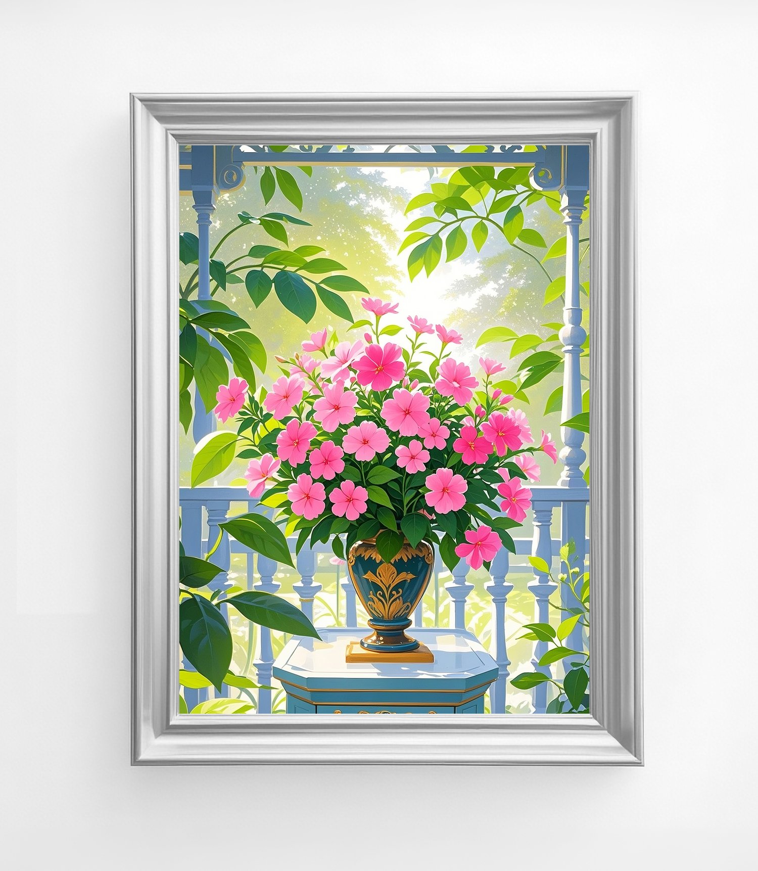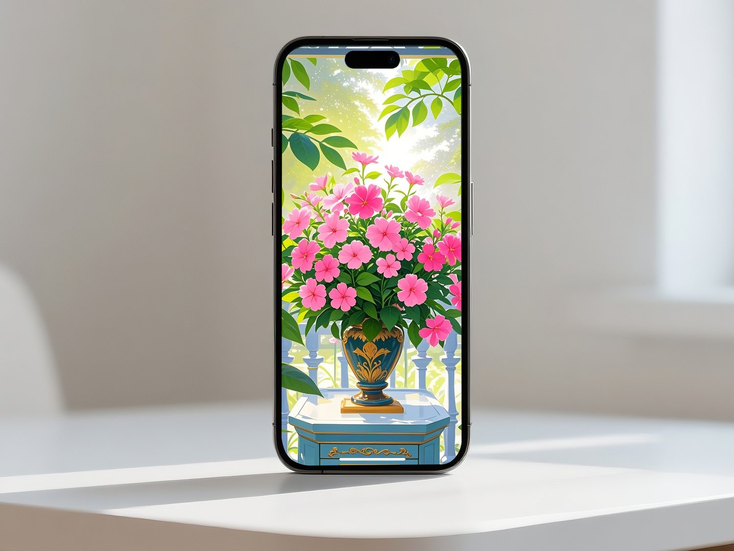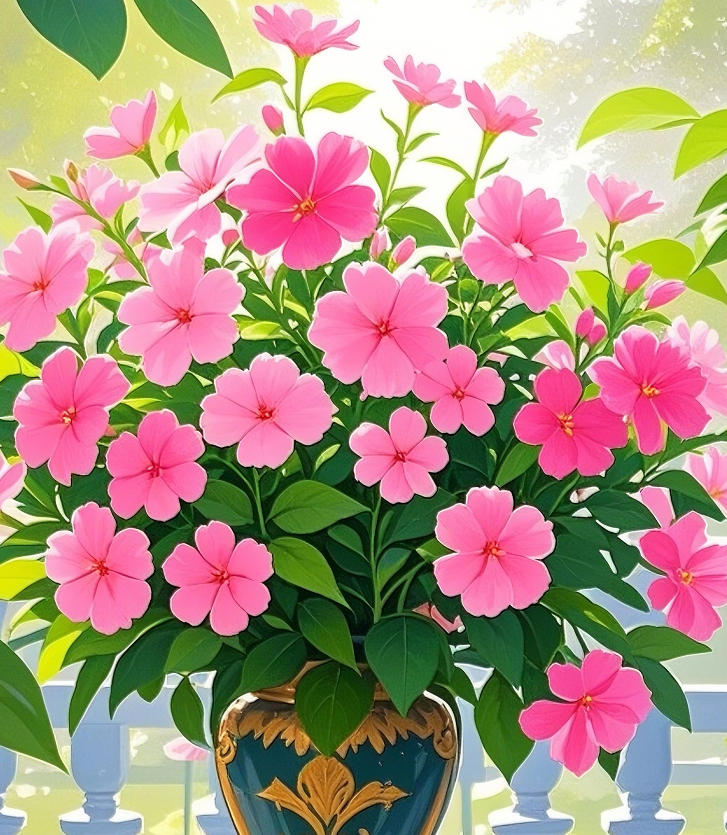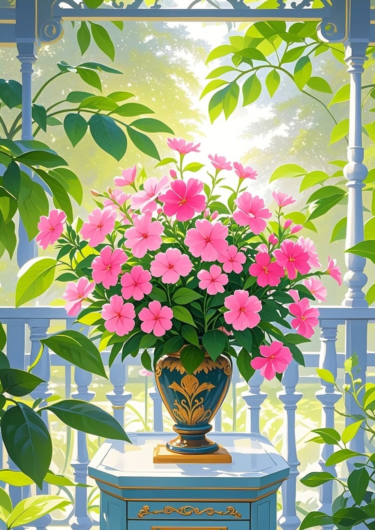 The soft morning sunlight streaming through the leaves illuminates the bright pink blossoms, creating a refreshing and uplifting atmosphere. The ornate vase adds a sense of elegance and sophistication, contrasting gracefully with the lush greenery in the background.