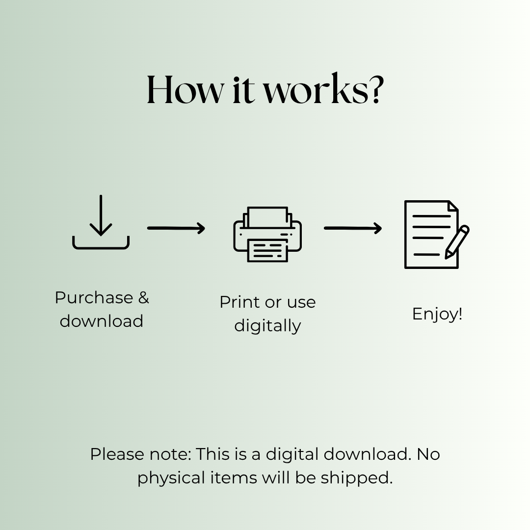 This digital PDF is ready to print on standard A4 or US Letter paper or use on tablets with apps like GoodNotes, Notability, or OneNote for easy, interactive journaling.