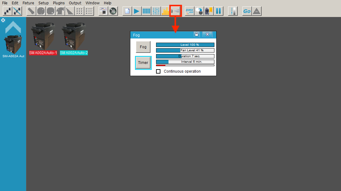 Con el Botón de “Fog” disparan humo mientras que esté presionado el botón. Al soltar apaga. Si activan el box de “Continuos Operation” queda apretado el botón por lo que largará humo hasta que lo vuelvan a presionar.