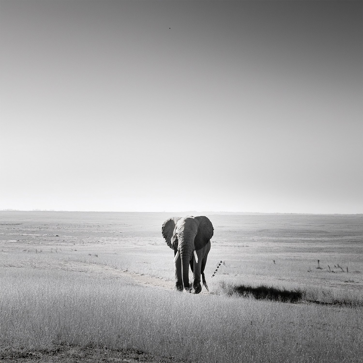 A quiet giant emerges from the muted morning light—this solitary bull elephant, captured in minimalist clarity, fills the frame with quiet power. The soft gray tones and subtle textures echo the hush of dawn, while a compact 60mm lens draws you close to every wrinkle, every whisper of stillness. In this empty field beneath a pale sky, strength and serenity meet in grayscale harmony.