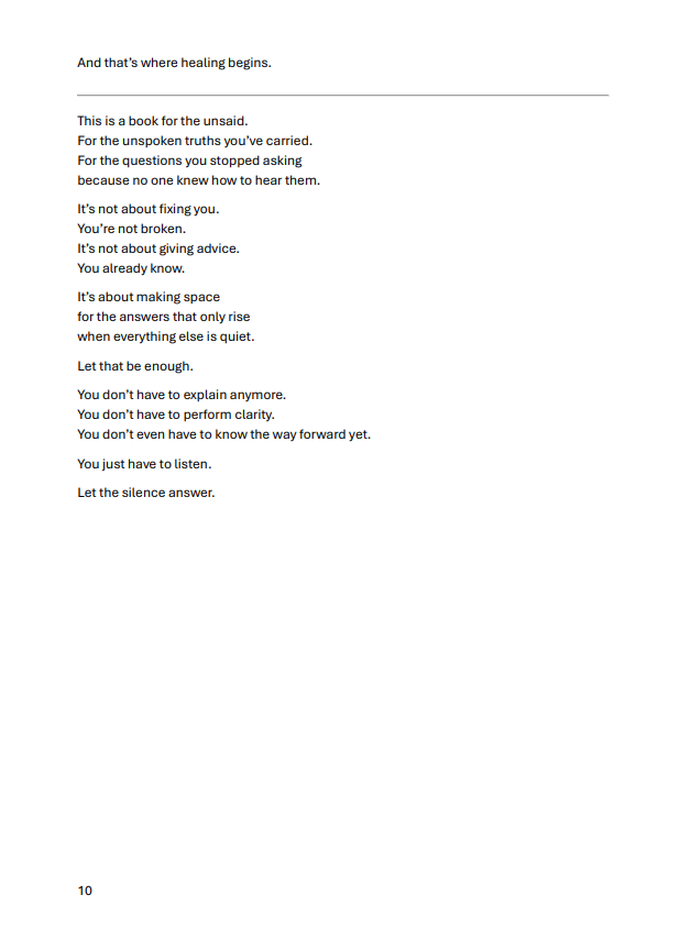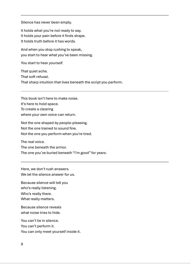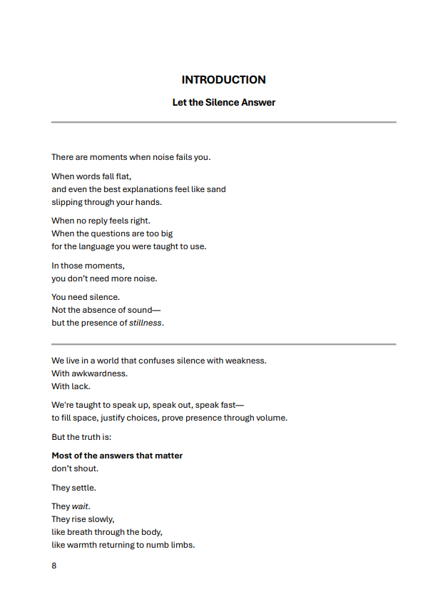 If you’ve ever felt unseen, unheard, or silenced by the world — this book will remind you: the answers you’ve been chasing may already be waiting in your silence.