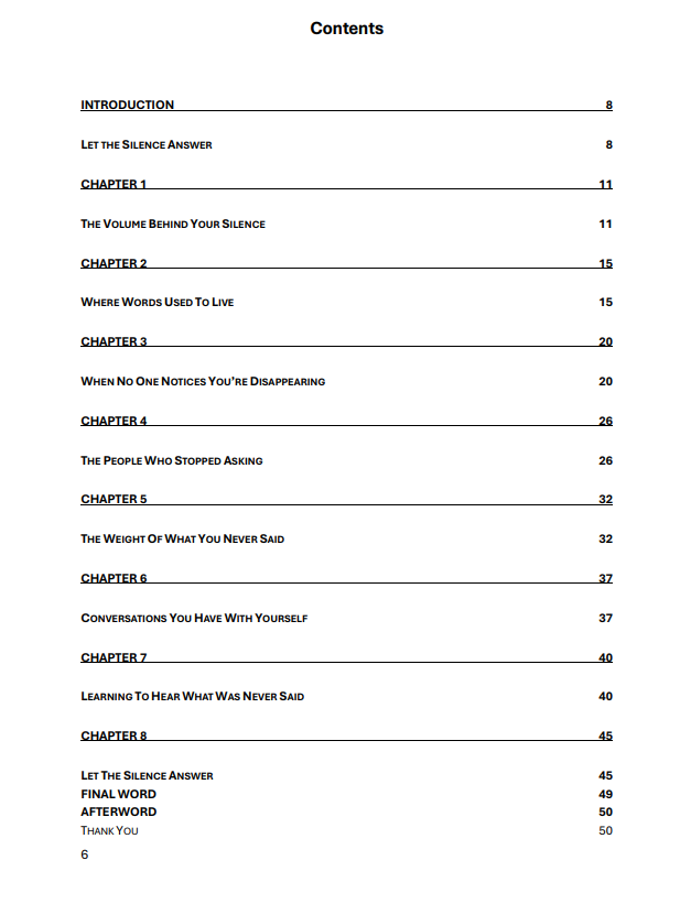 In a world that worships noise, Let the Silence Answer is a book about the power of stillness — and the truths that only rise when you stop performing, stop explaining, and stop rushing to be understood.