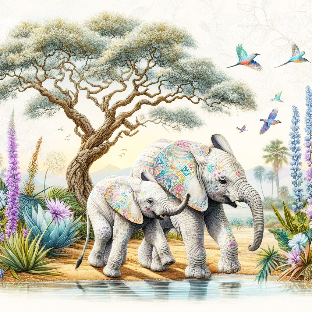Colourful elephants beside a water hole & beautiful twisted patterned tree. There are humming birds, wild flowers a setting sun.