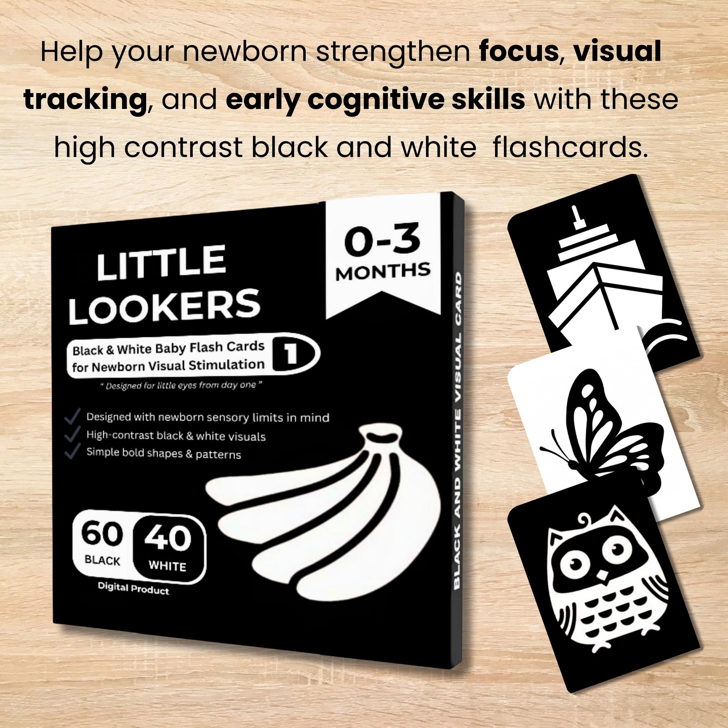 In the first three months, babies can only see strong contrasts, simple shapes, and bold outlines. These flashcards help your baby: