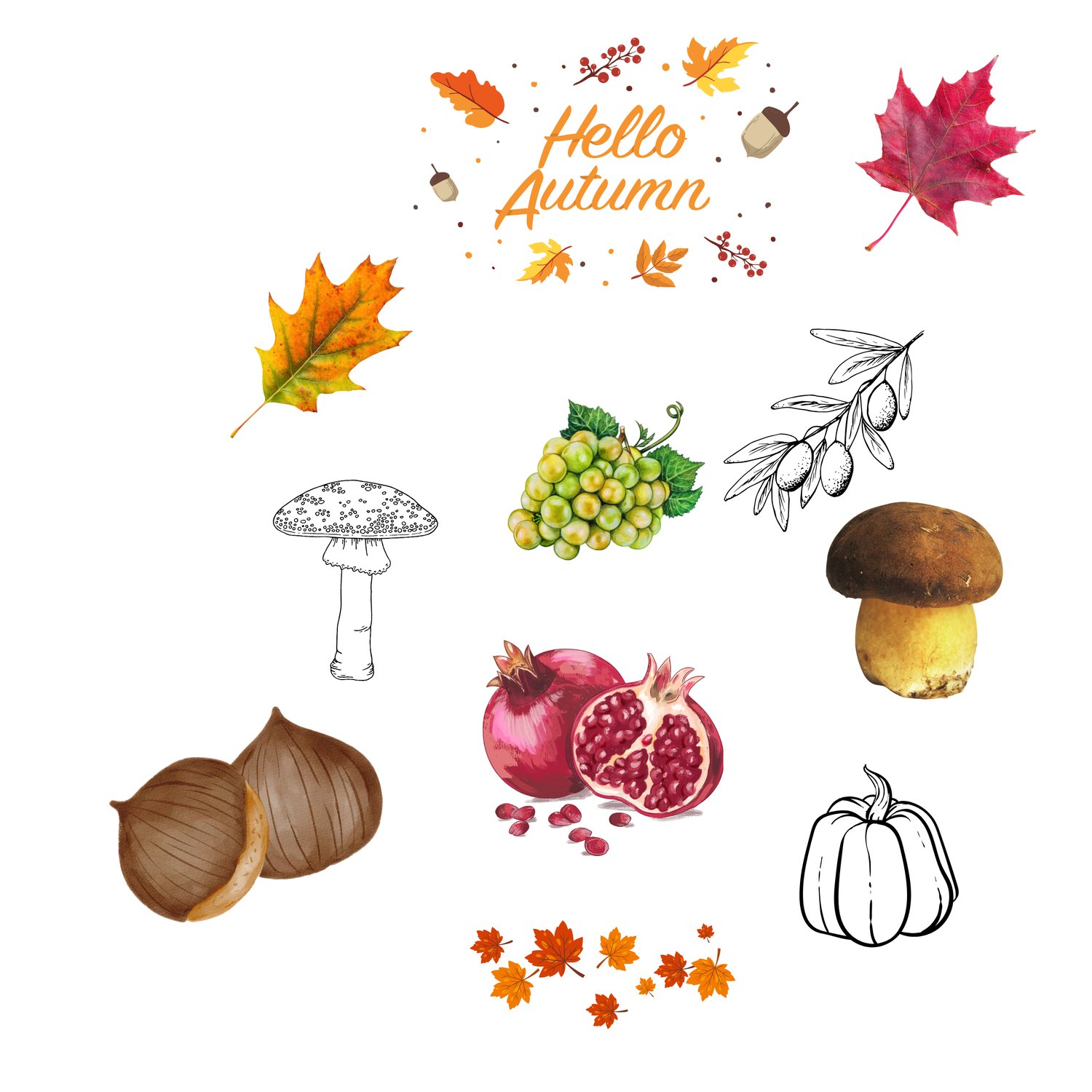 Per ogni elemento, la raccolta riporta immagini a colori reali e disegnate e immagini da colorare con diversi livelli di stilizzazione, a seconda dell’età dei bambini a cui presentarle e dei vostri gusti. Foglie, funghi, melagrane, zucche, noci, ghiande, olive, uva: molti dei tanti frutti che l'autunno ci offre.