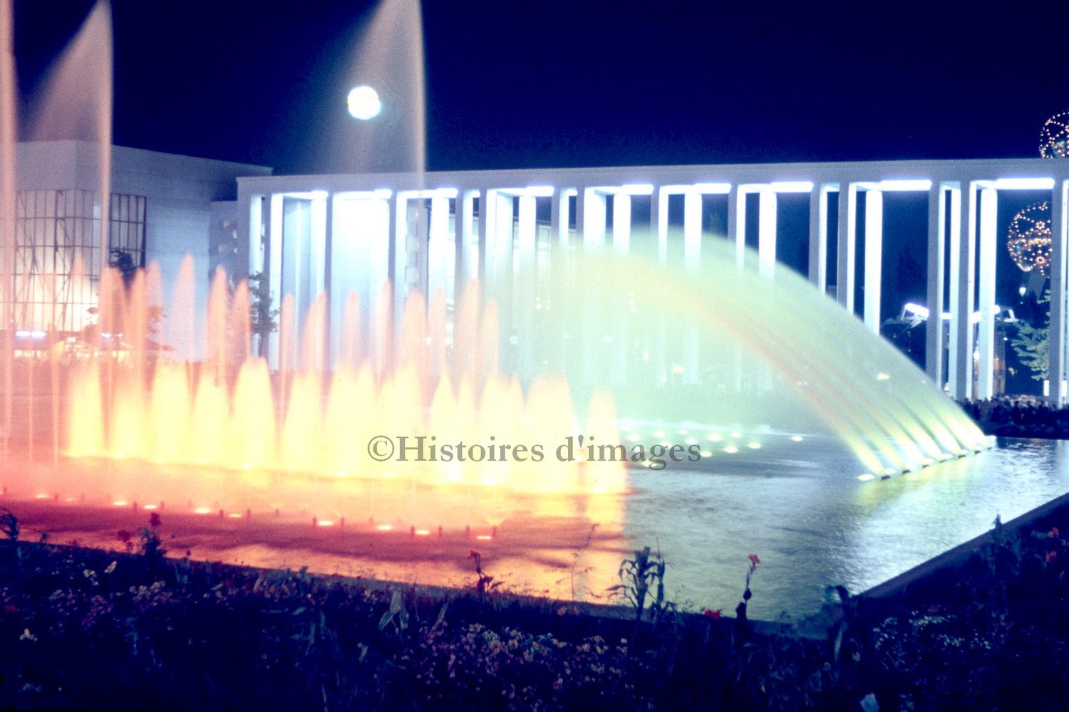 Plongez dans la magie de l'Exposition universelle de 1958 avec cette photo rare et lumineuse, capturée de nuit. Les illuminations révèlent l’atmosphère unique de l’Expo 58, entre modernité et élégance d'après-guerre.
