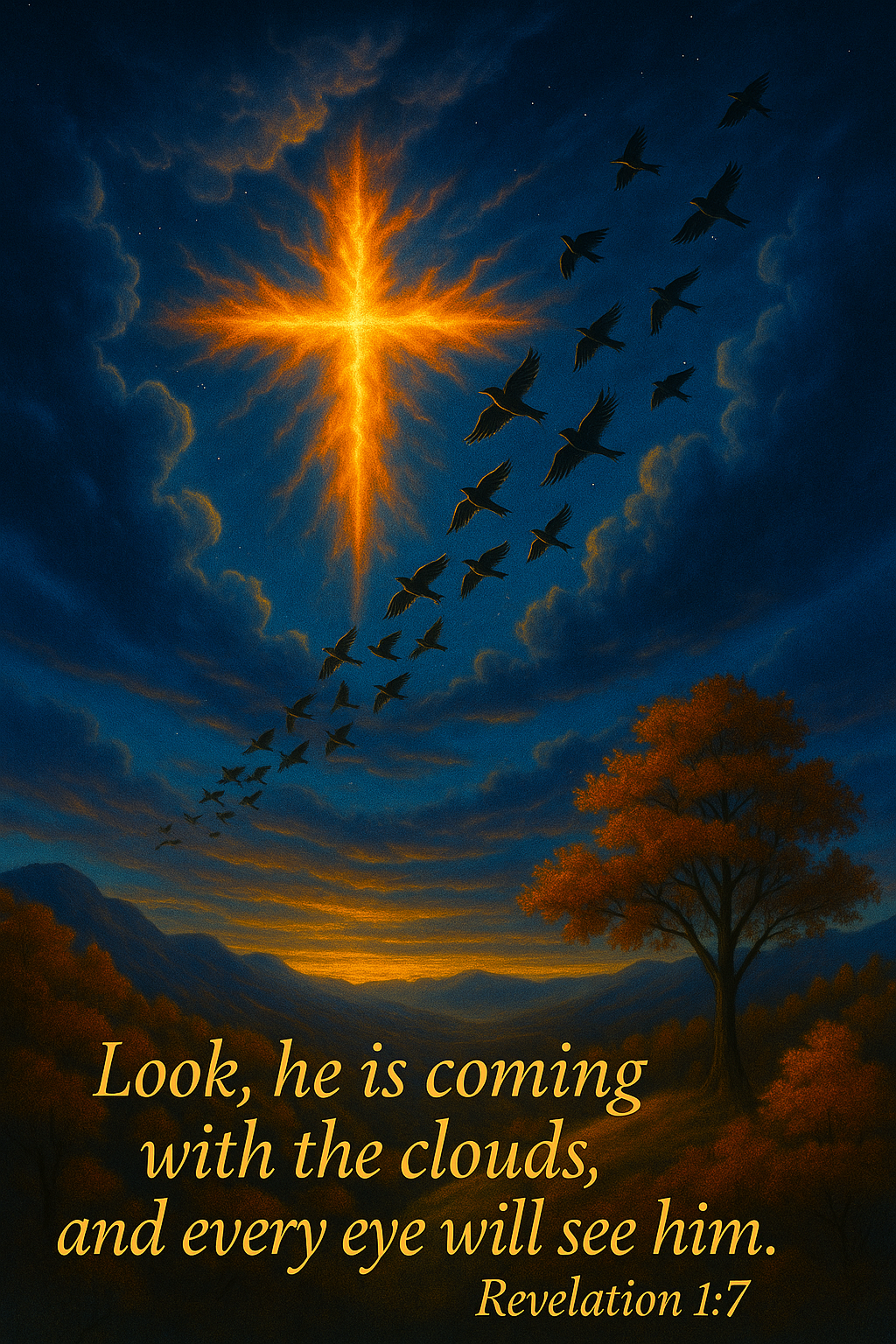 Prepare hearts for glory with this Christian Prophetic Scripture Wall Art featuring Revelation 1:7, illustrated with a radiant cross-shaped light formation in the sky, surrounded by birds and clouds over a peaceful autumn landscape. This printable is ideal for faith-based homeschool decor, devotional kits, and ministry bundles, offering a visual and spiritual reminder of Christβs promised return and the awe of divine revelation.
