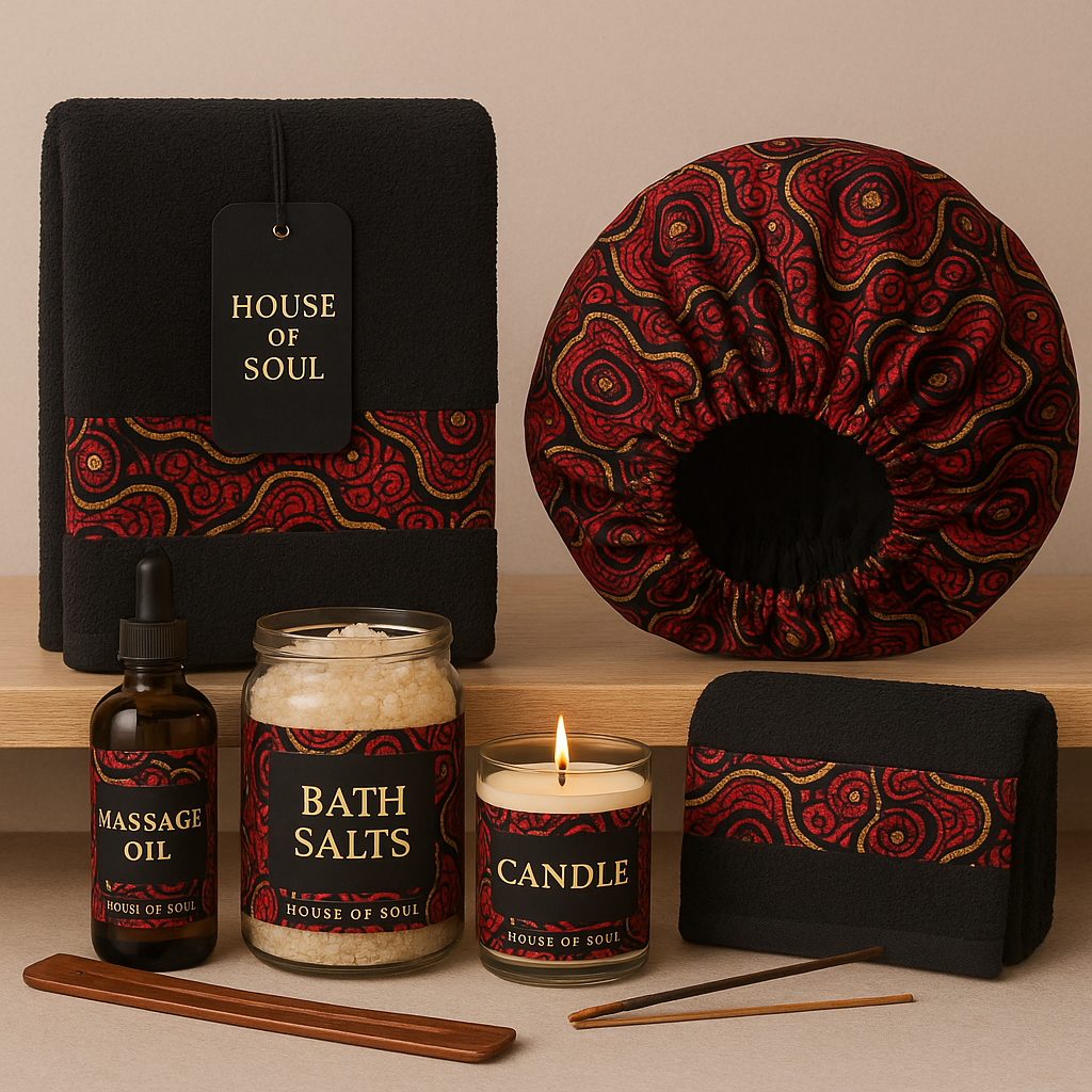 Transform your self-care ritual into a soulful experience with the Soul Sanctuary Spa Set by House of Soul. This deluxe 7-piece collection is wrapped in deep, vibrant Ankara-inspired patterns in bold reds, golds, and blacks—celebrating heritage, healing, and holistic wellness.