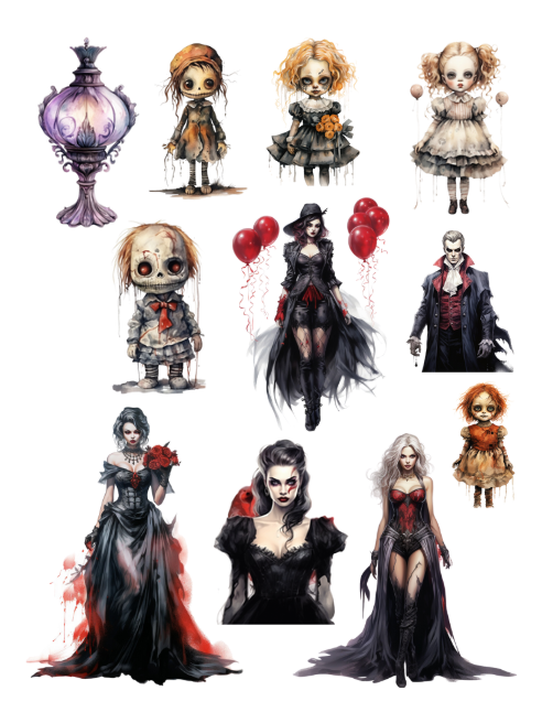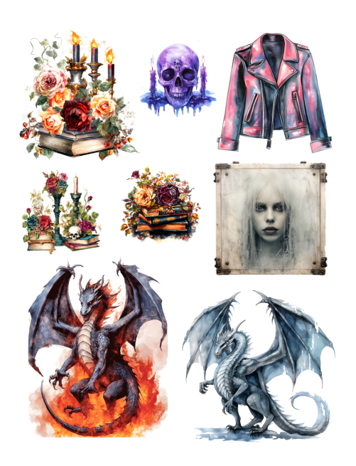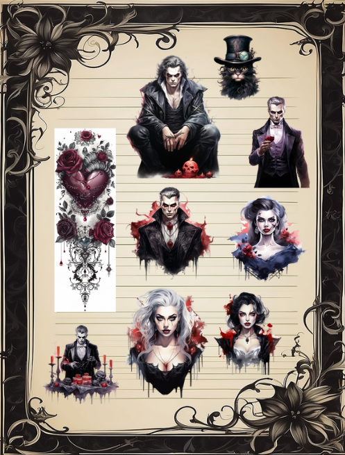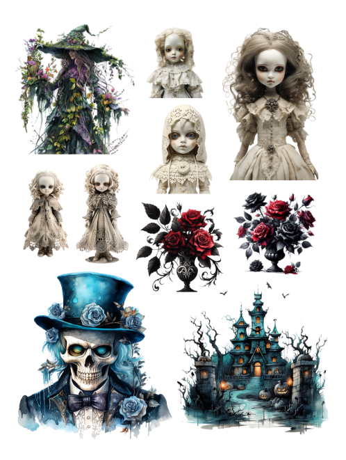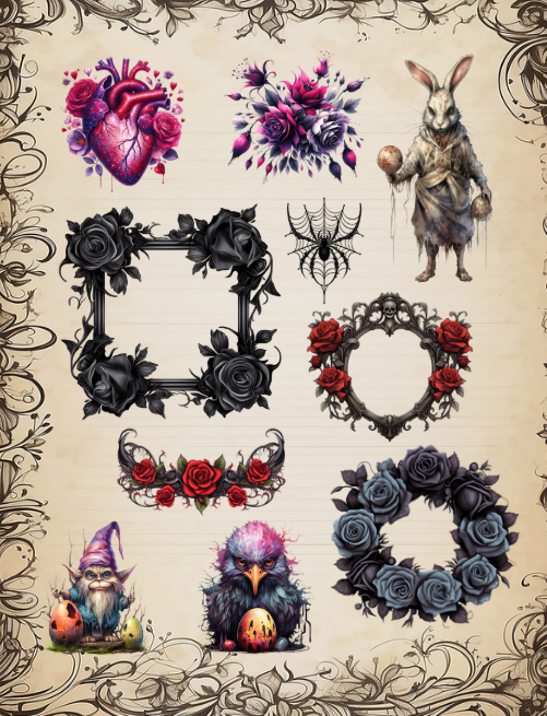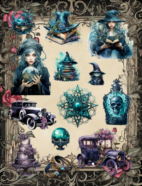 This beautiful cut and collage spooky gothic ephemera book features witches, gentlemen, beautiful gothic ladies, children, dolls, ghosts and goblins, witches, flowers, skulls, dragons, Easter gothic elements, scenery, gates, frames, roses, lovers, cake, spiders, haunted goblins, gothic windows, gothic benches, spooky gothic houses, food, haunted trees, birdcages, stone paths, and much more. Decorate your planner with these lovely ephemera pieces, it's all the rage!