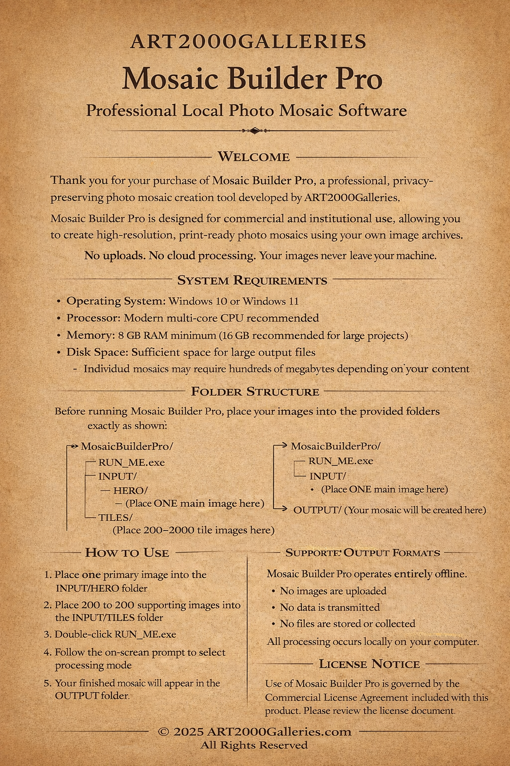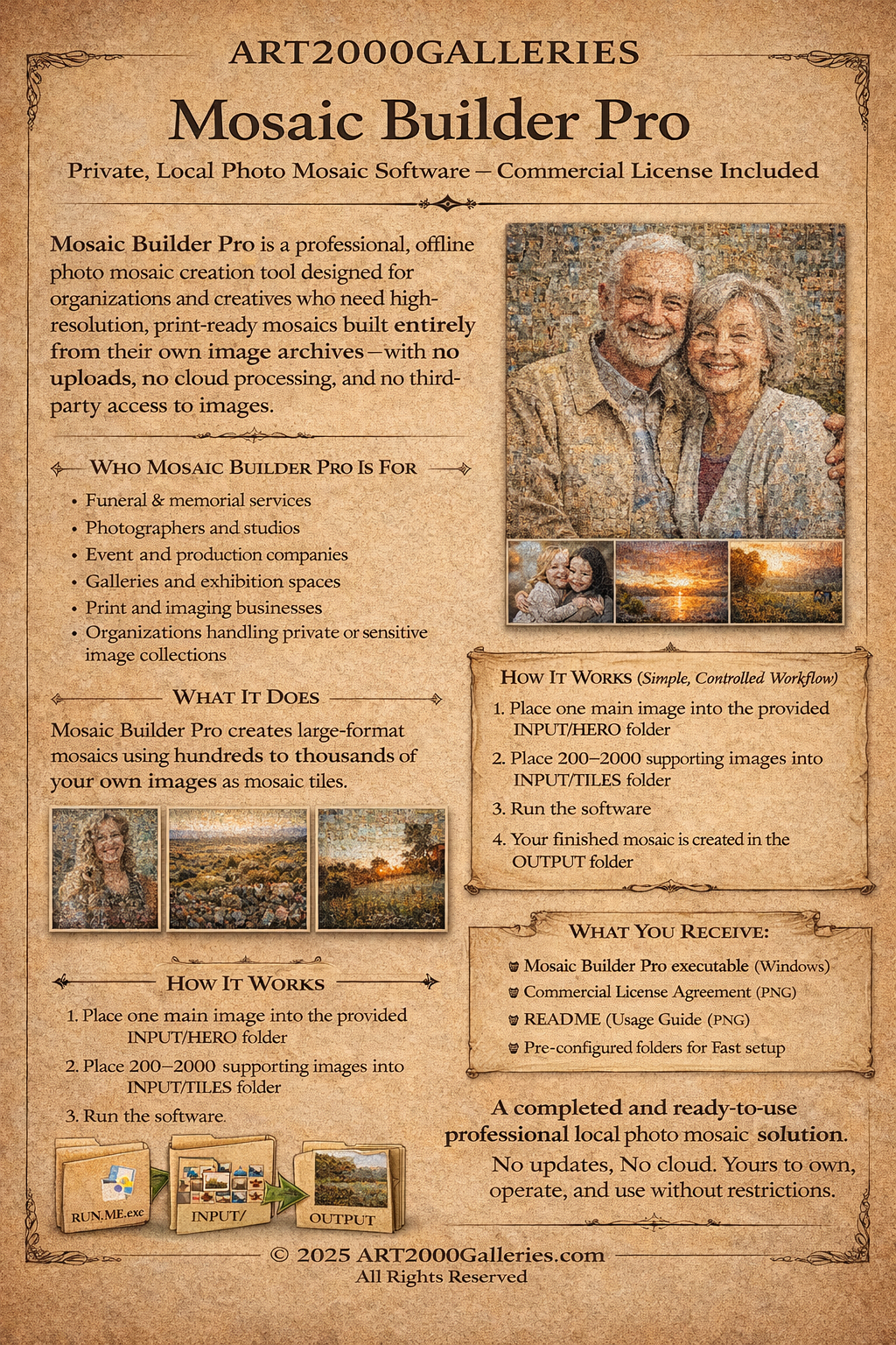 Mosaic Builder Pro is a professional, offline photo mosaic creation tool designed for organizations and creatives who need high-resolution, print-ready mosaics built entirely from their own image archives—with no uploads, no cloud processing, and no third-party access to images.