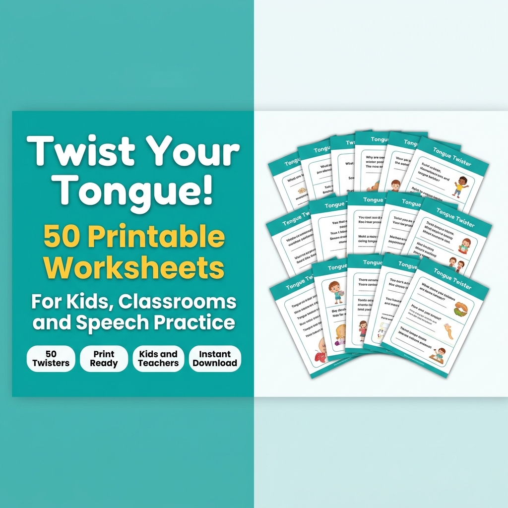 Twist Your Tongue! is a pack of 50 beautifully designed, print-ready A4 worksheets covering the most famous English tongue twisters. Perfect for kids, classrooms, speech therapy sessions, and family game nights.