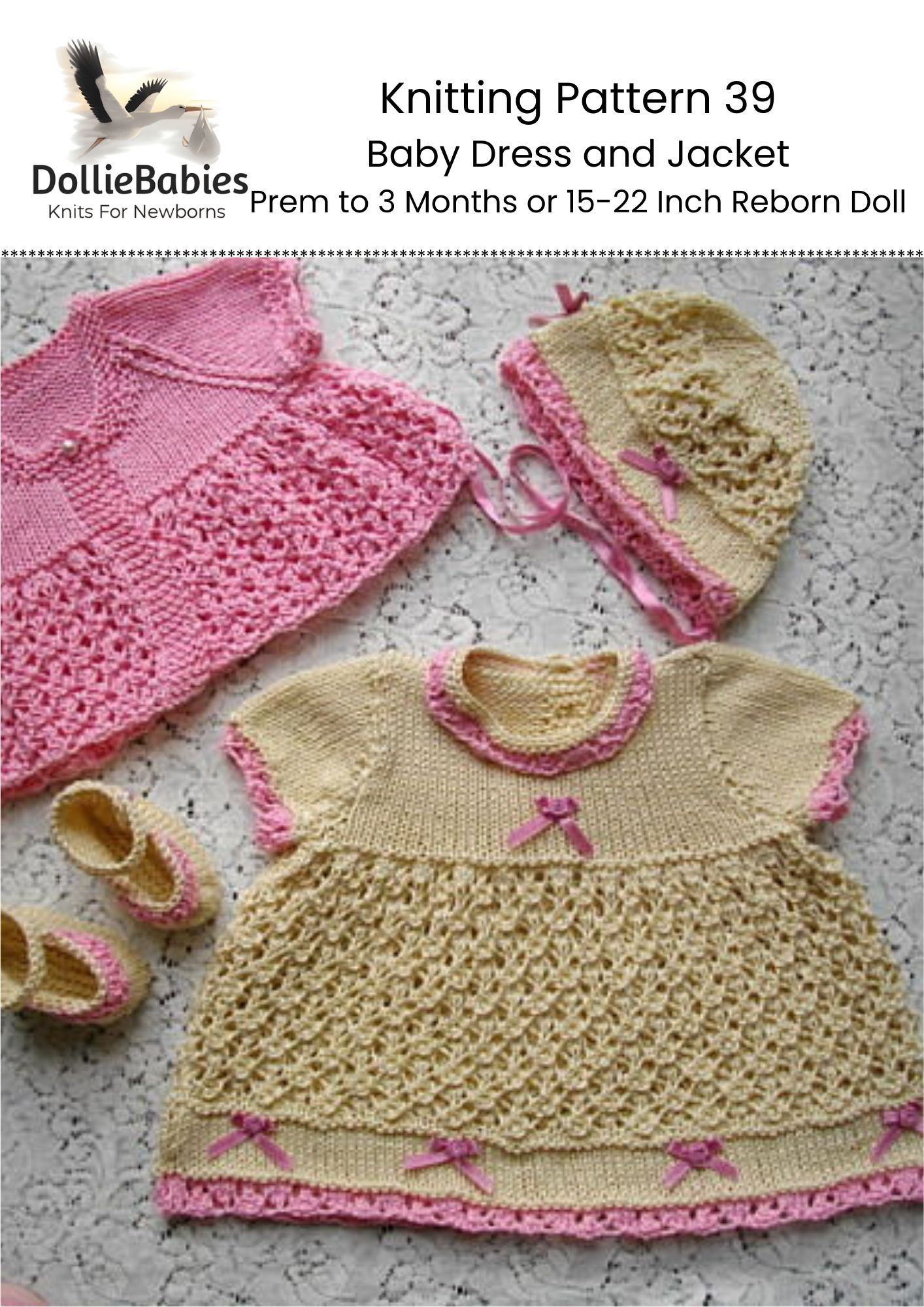 Instant download PDF knitting pattern to knit a raglan short sleeve lacy dress, matching matinee jacket, bonnet and bootees for babies or reborn dolls.