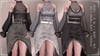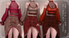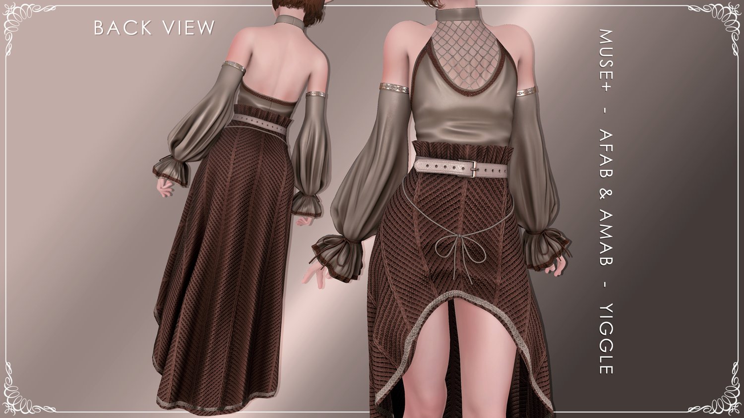 A two-piece fantasy adjacent outfit consisting of a halter top with detached bell sleeves, and a knitted skirt.
