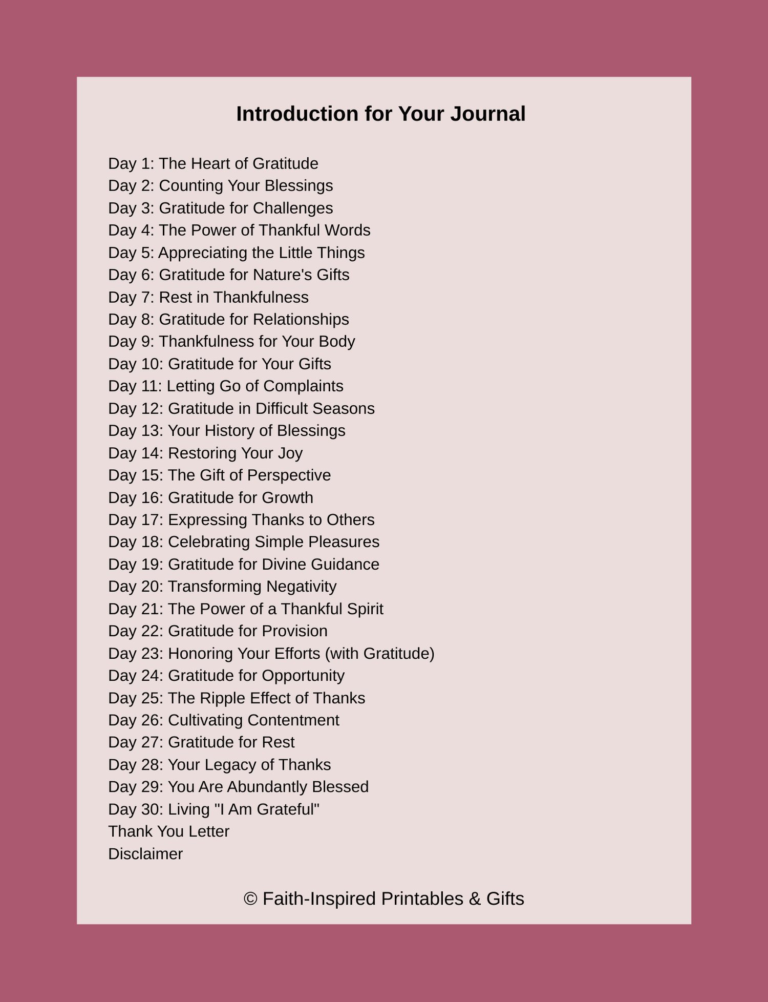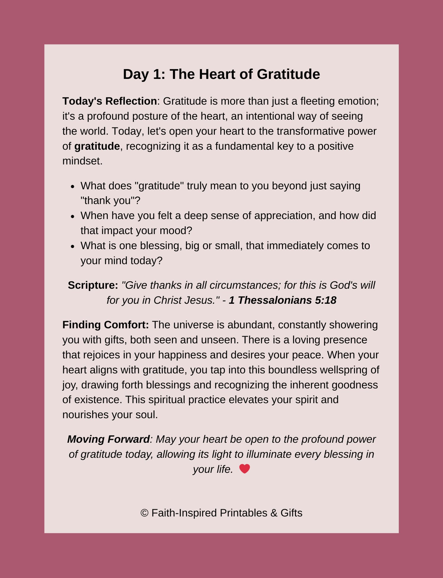 πThis beautifully crafted digital devotional journal is designed to guide you day by day, shifting your perspective and opening your heart to a consistent wellspring of thankfulness. Each of the 30 days offers heartfelt inspiration, powerful insights, and gentle spiritual principles to uplift your spirit and anchor your mindset in grace.