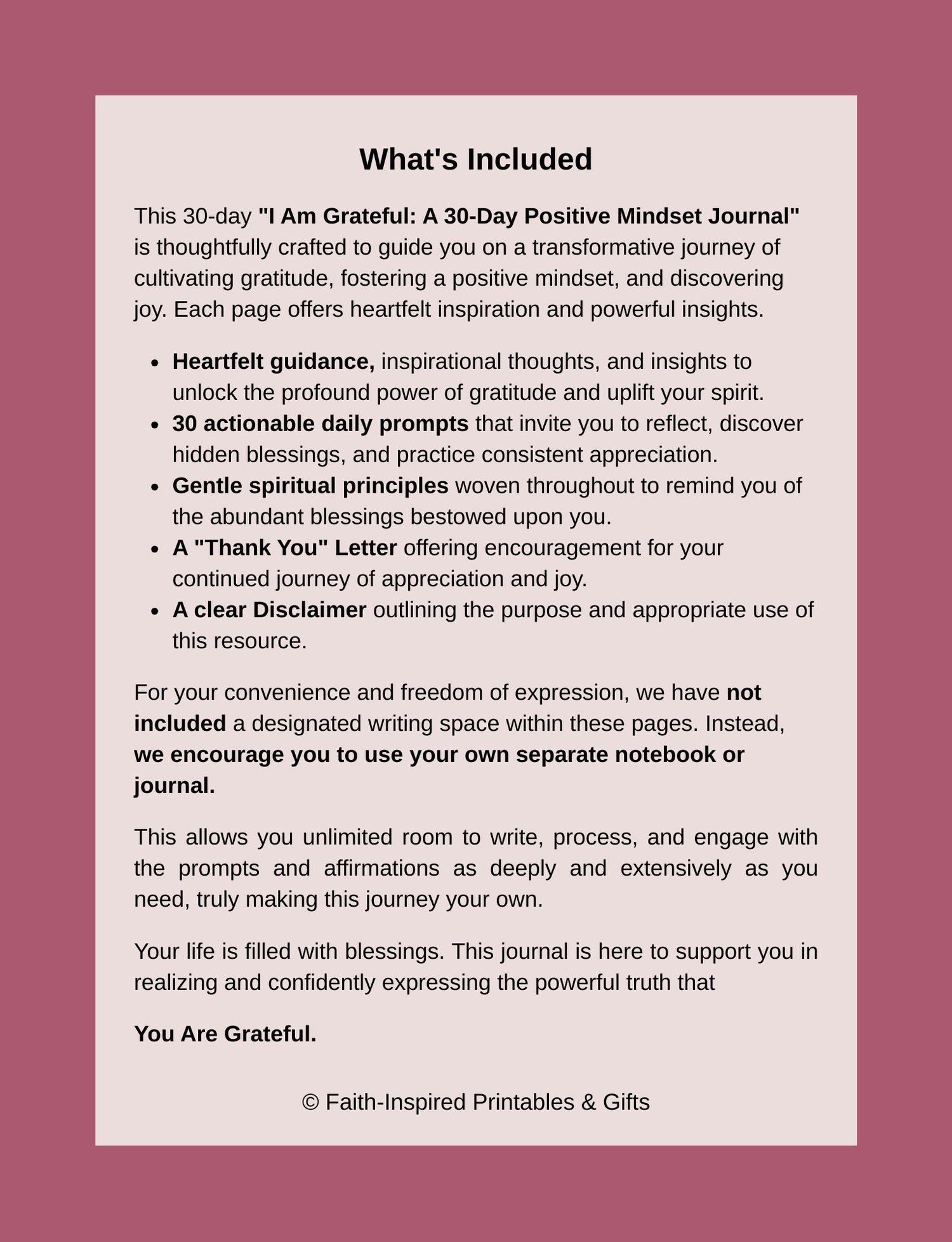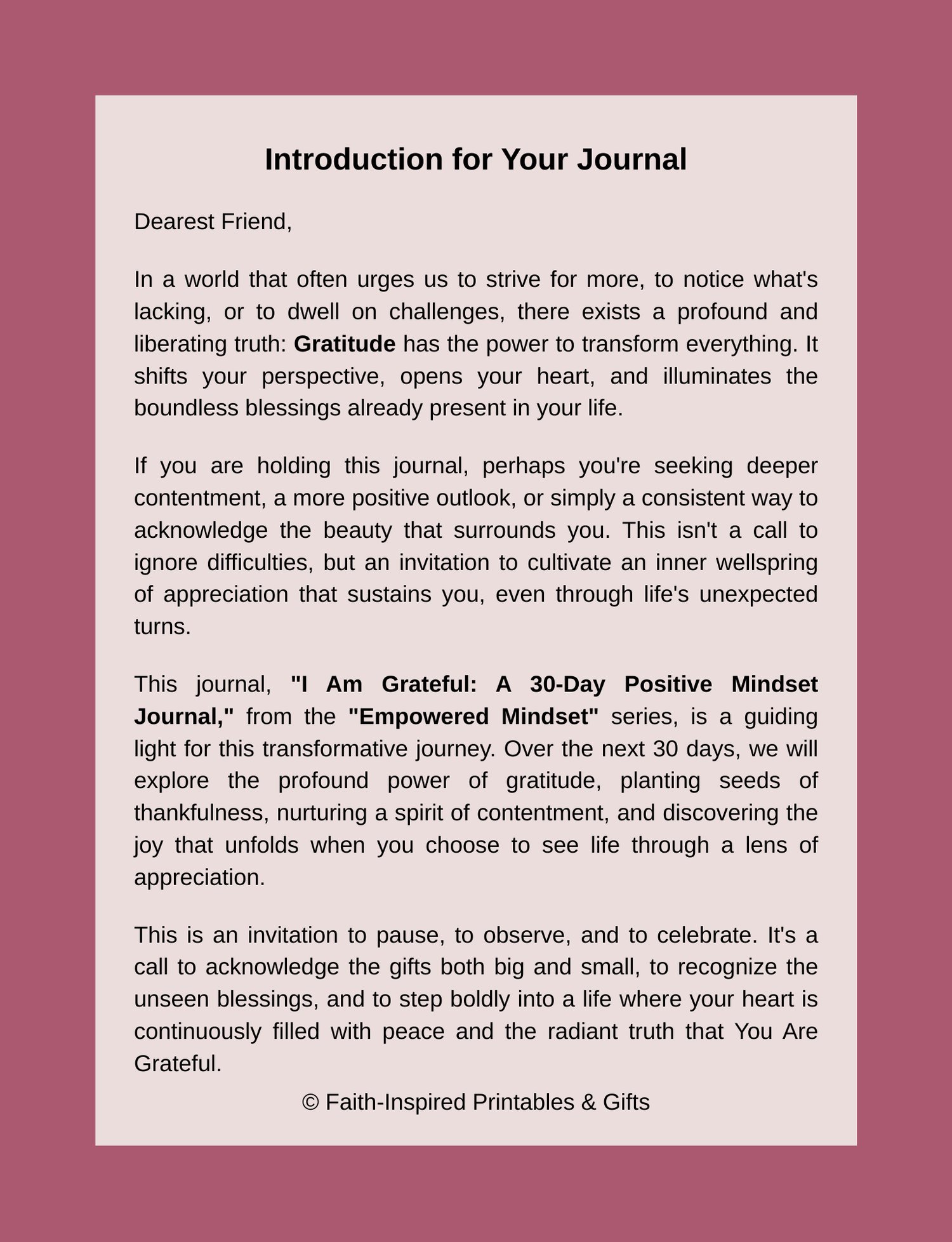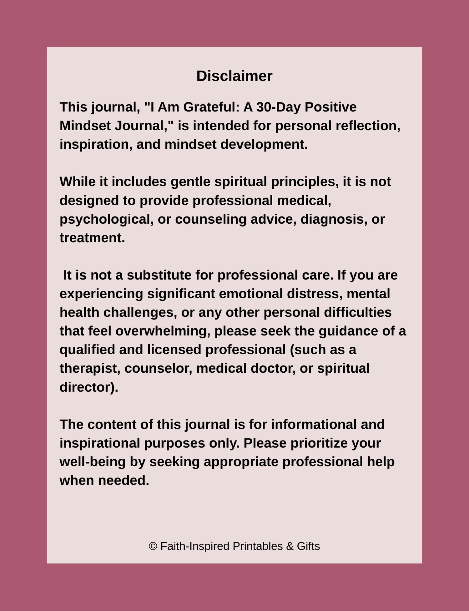 βοΈDisclaimer: This journal, "I Am Grateful: A 30-Day Positive Mindset Journal," is intended for personal reflection, inspiration, and mindset development only. While it includes gentle spiritual principles, it is not designed to provide professional medical, psychological, or counseling advice, diagnosis, or treatment. It is not a substitute for professional care. If you are experiencing significant emotional distress, mental health challenges, or any other personal difficulties that feel overwhelming, please seek the guidance of a qualified and licensed professional (such as a therapist, counselor, medical doctor, or spiritual director). The content of this journal is for informational and inspirational purposes only. Please prioritize your well-being by seeking appropriate professional help when needed.