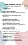 Health and Wellness Guide (Part 1): Embracing a Healthy Lifestyle introduces readers to the concept of health preservation, emphasizing its importance for overall well-being. The book explores practical methods, including moderate exercise, quality sleep, stress management, and natural therapies like Traditional Chinese Medicine (TCM). It highlights the role of nutrient-rich foods such as vegetables, fruits, whole grains, proteins, and healthy fats in promoting wellness. Additionally, it delves into the benefits of traditional Chinese health-preservation soups and teas, offering recipes and insights into their therapeutic effects. This guide provides a holistic approach to achieving and maintaining a healthy, balanced lifestyle.