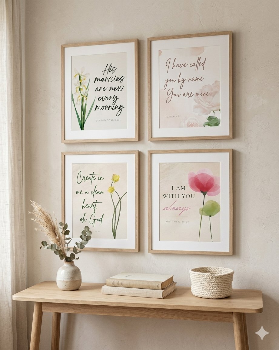 Designed with delicate watercolor florals, light neutral tones, and elegant typography, this collection creates a peaceful, faith-filled atmosphere in any space.