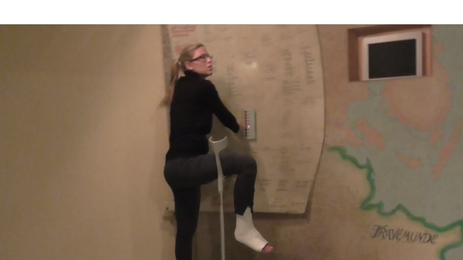 Sarah is crutching around a museum and looking at what it was like in her hometown in the past.She sits down and shows us how agile she is even though she has an SLC on her right leg.we take the chance and take a good look at Sarah SLC and her red-painted toes before continuing her walk at the museum