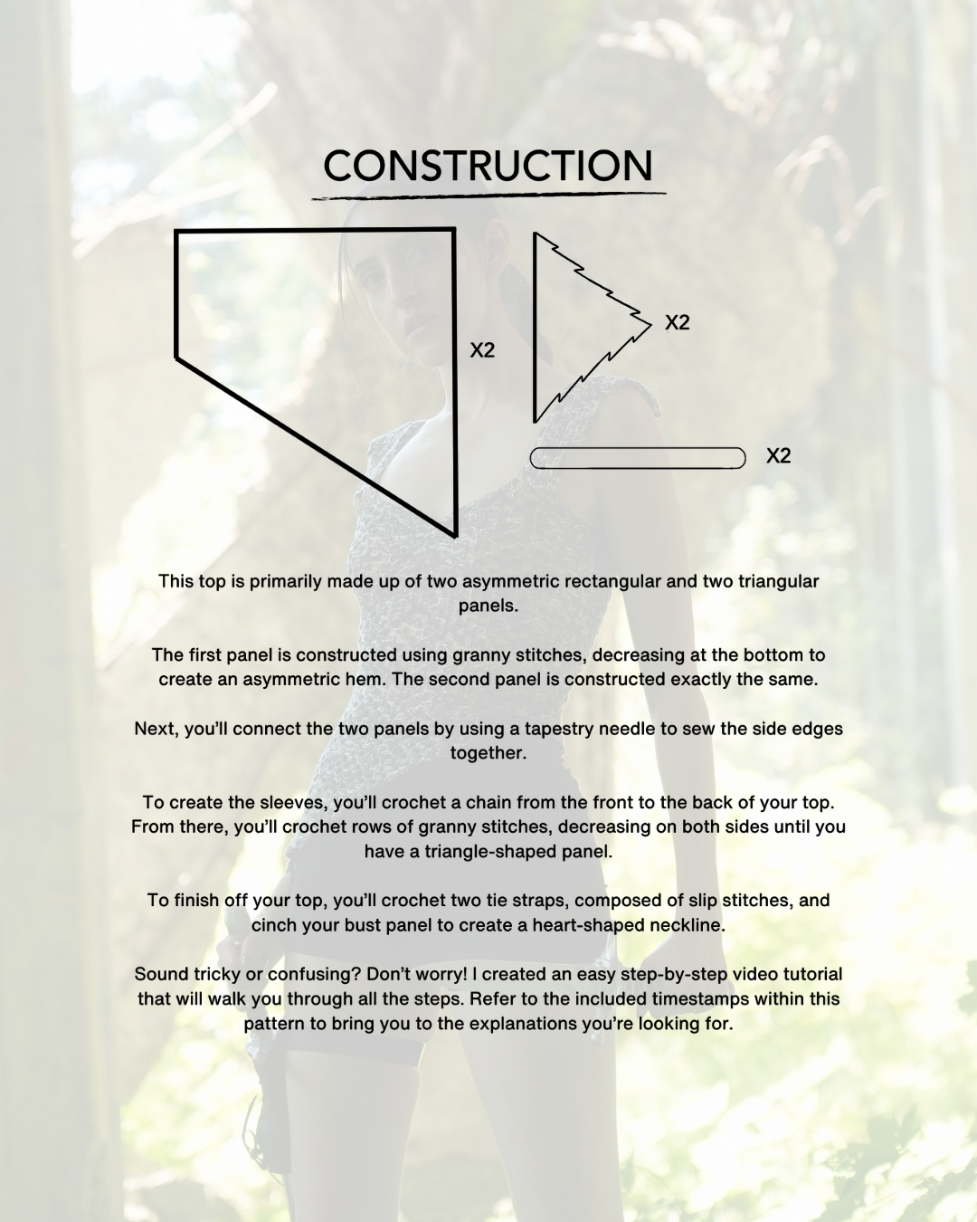 The pattern includes: a list of abbreviations, written instructions, stitch diagrams, and a video tutorial that shows all of the steps.