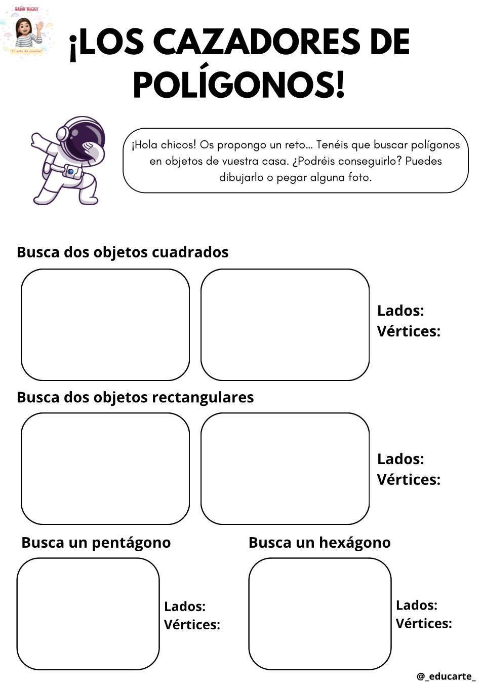 Ya puedes descargar la ficha "Cazadores de Polígonos", una propuesta divertida para que los peques exploren su entorno en busca de triángulos, cuadrados, pentágonos y muchas formas más.