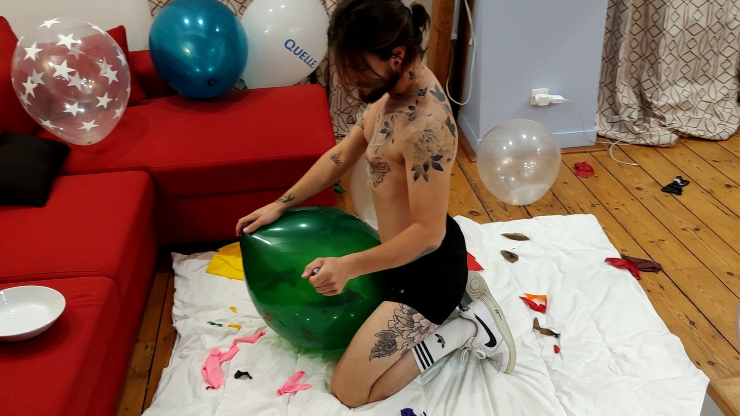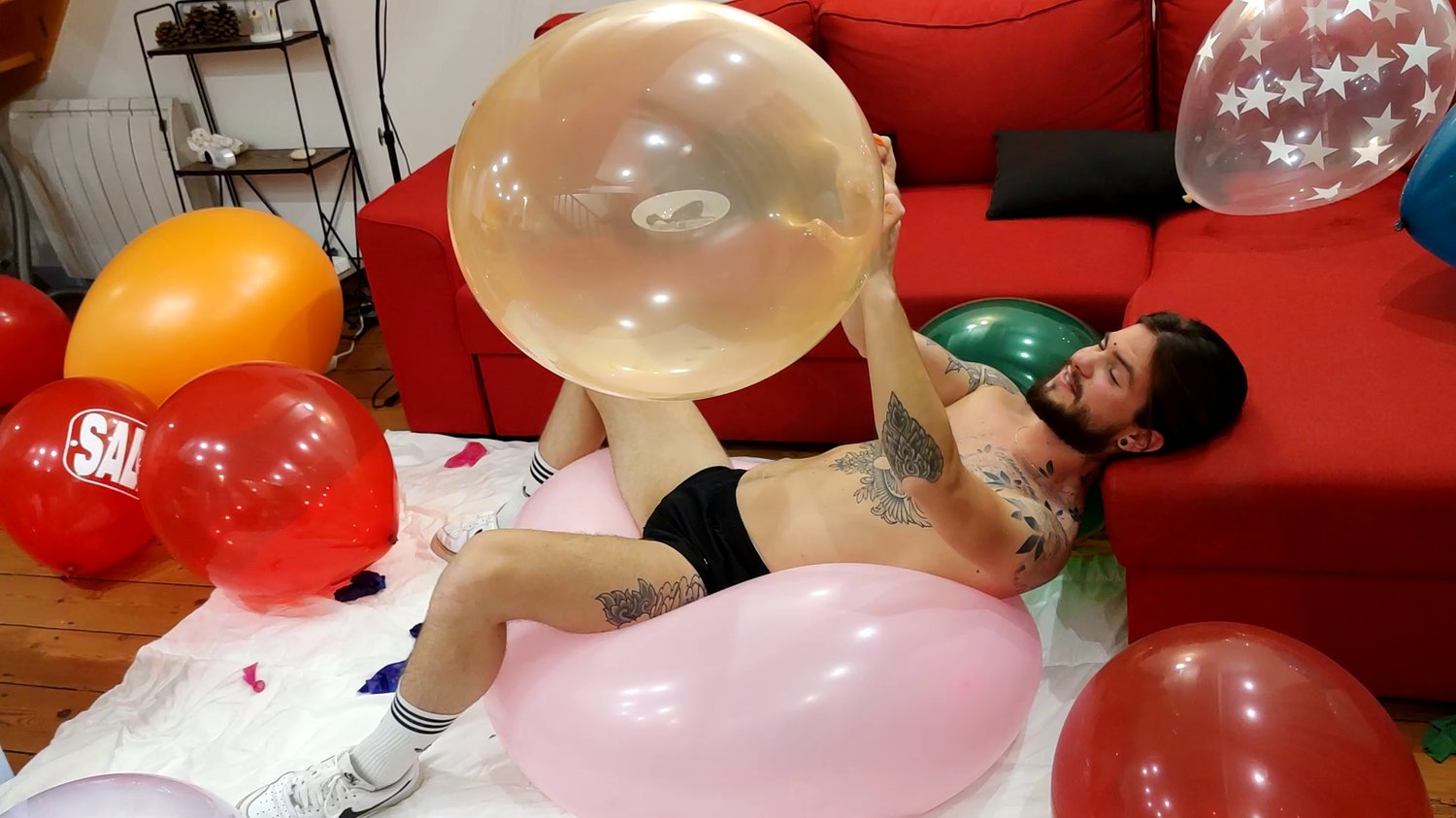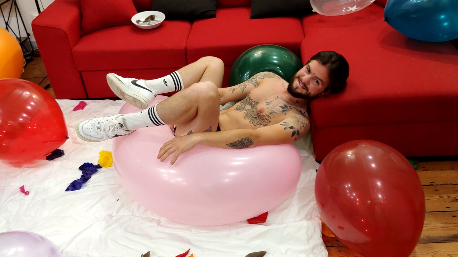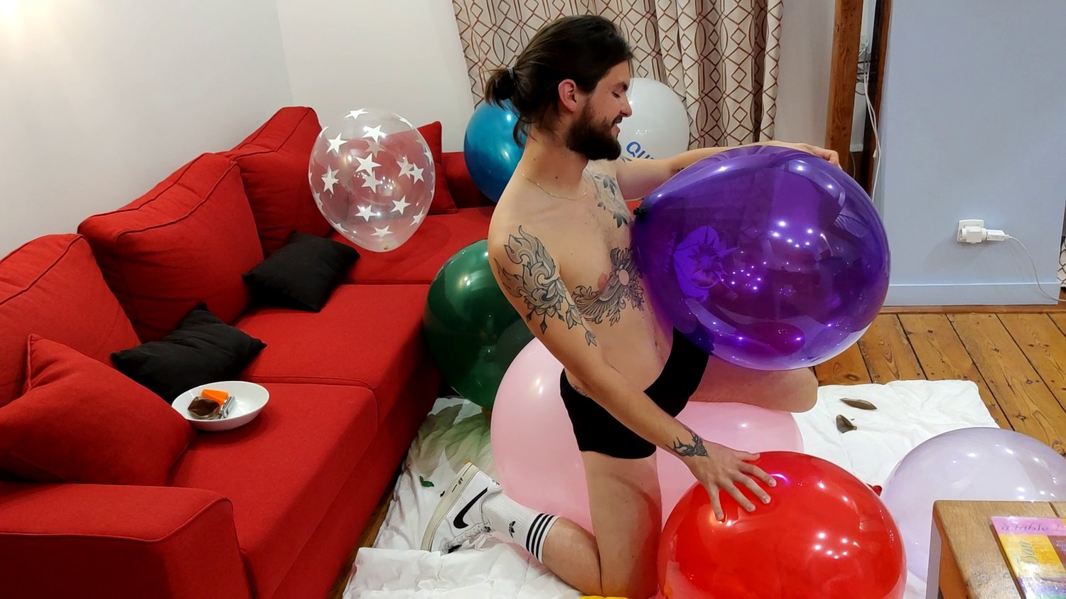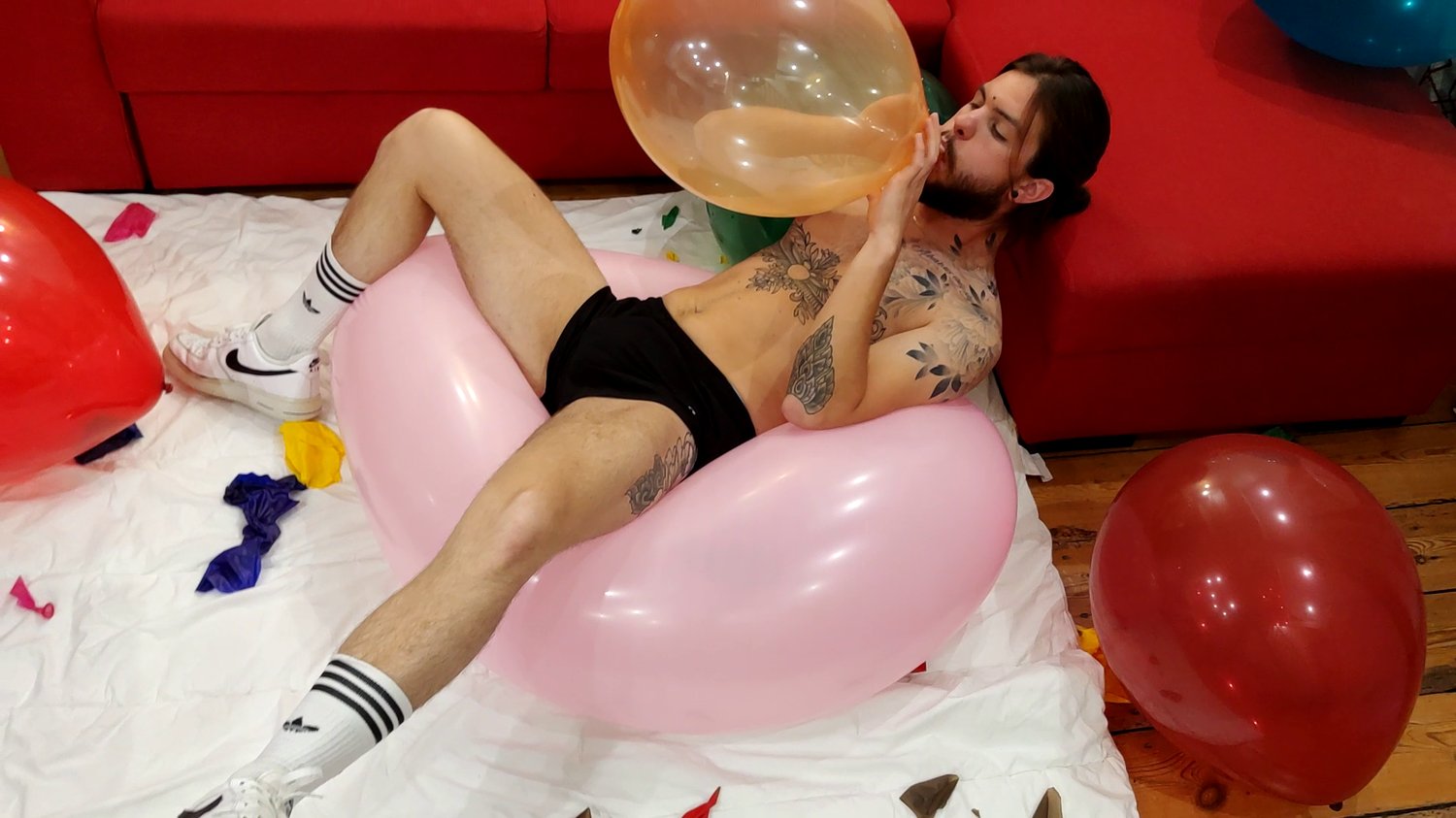 In this video Léo a french sexy inked guy have fun blowing and popping balloons.