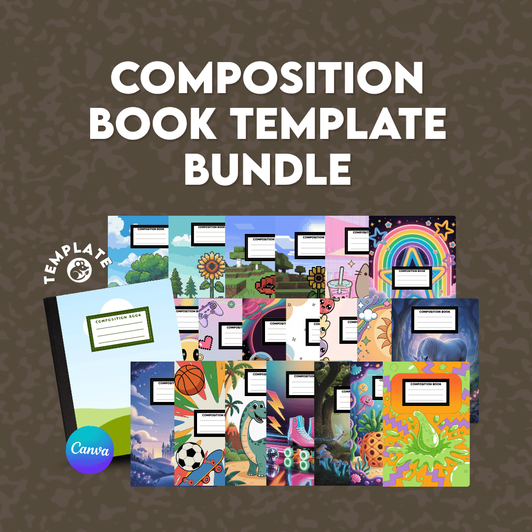 Editable Composition Notebook Covers Canva Template – 20-Pack | Kid-Friendly & Trendy Themes