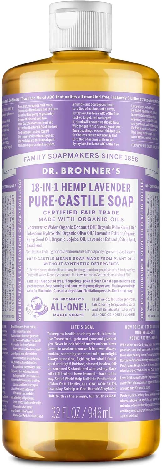 Dr. Bronner's Pure Castile Liquid Soap - Made with Regenerative Organic Certified Oils - 18-in-1 Uses for Face, Body, Hand, Hair- Gentle on Sensitive Skin - All Natural Body Wash- Lavender,32oz