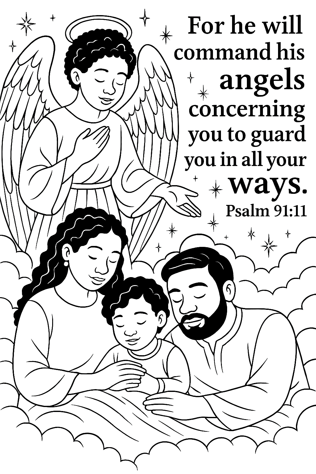 👼 Angels Guard Us – Psalm 91:11 Family Scripture Coloring Page