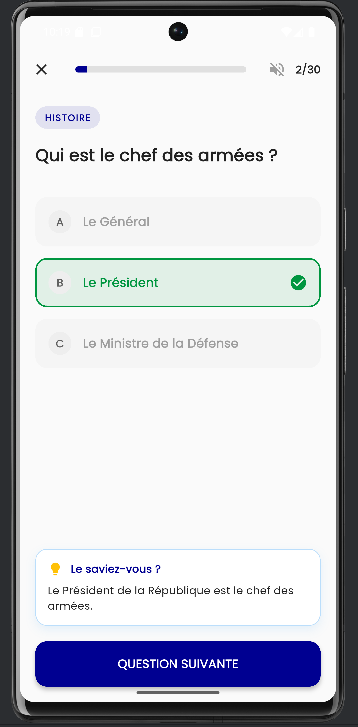 Avec un suivi de progression clair, des quiz intelligents et la possibilité de passer en version Premium sans publicité pour un accès illimité et une concentration optimale, "Mon Parcours Citoyen" est votre compagnon idéal pour maîtriser les connaissances requises et faire de votre objectif de citoyenneté une réalité.