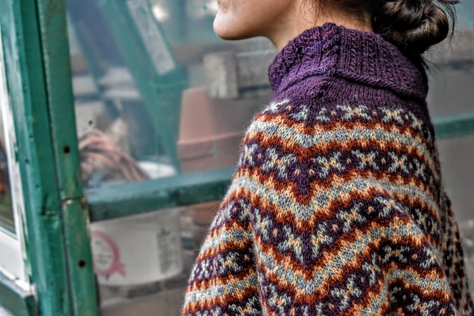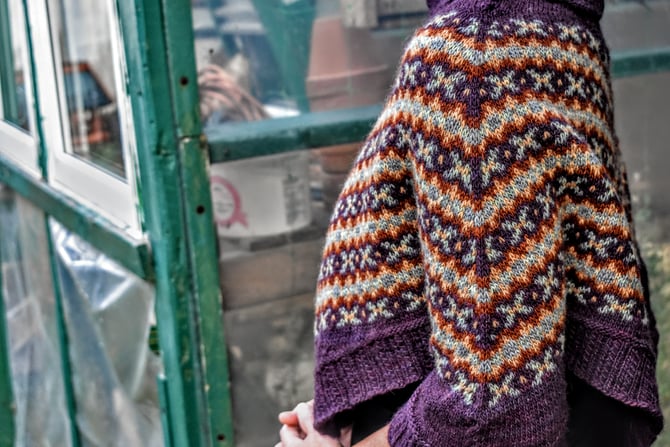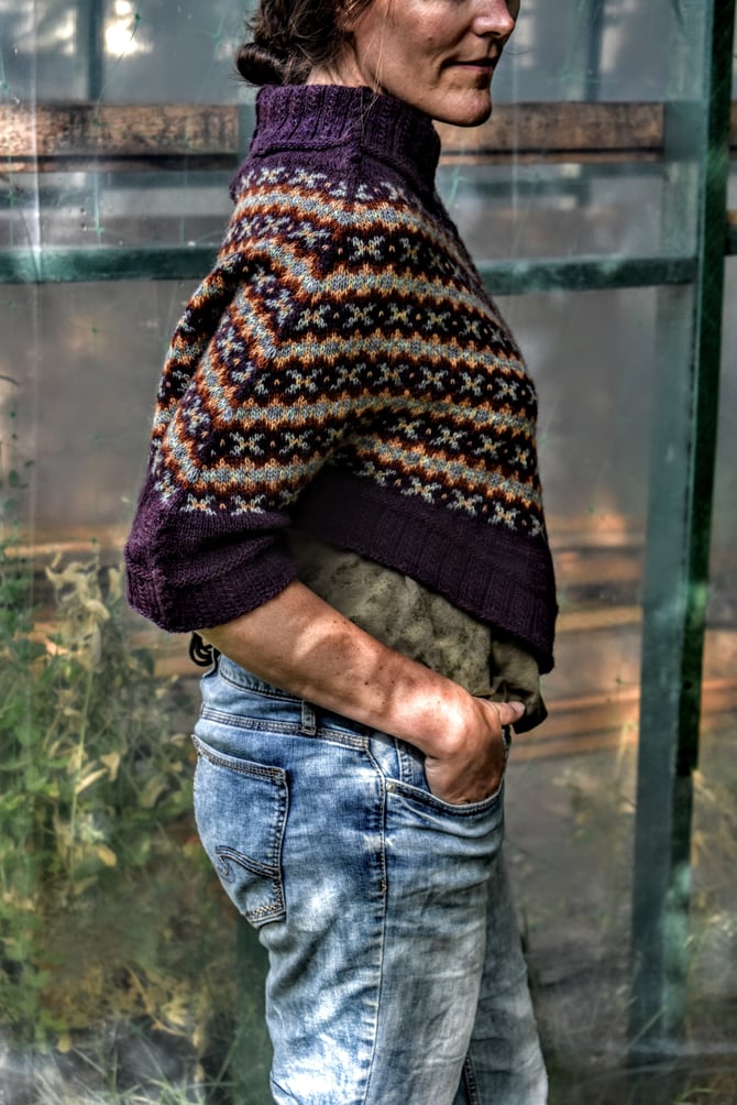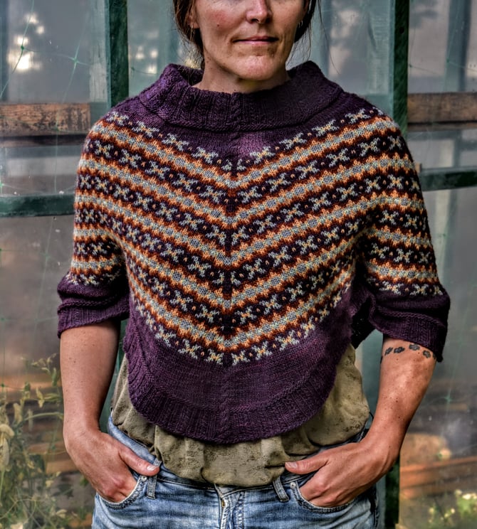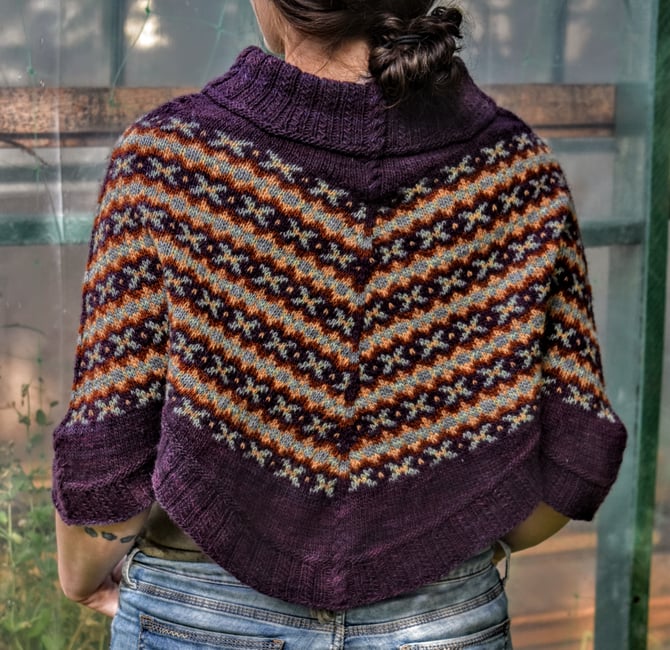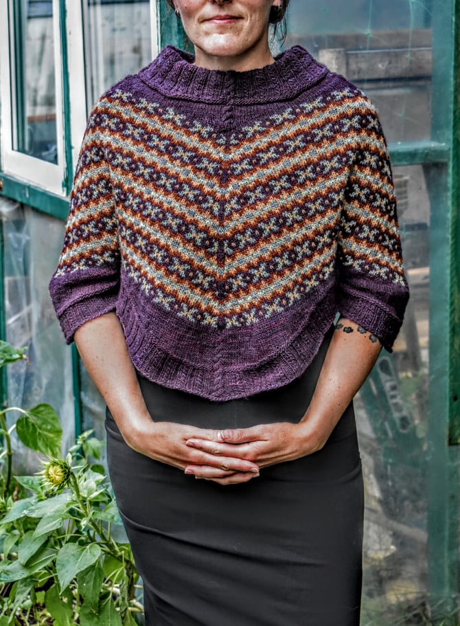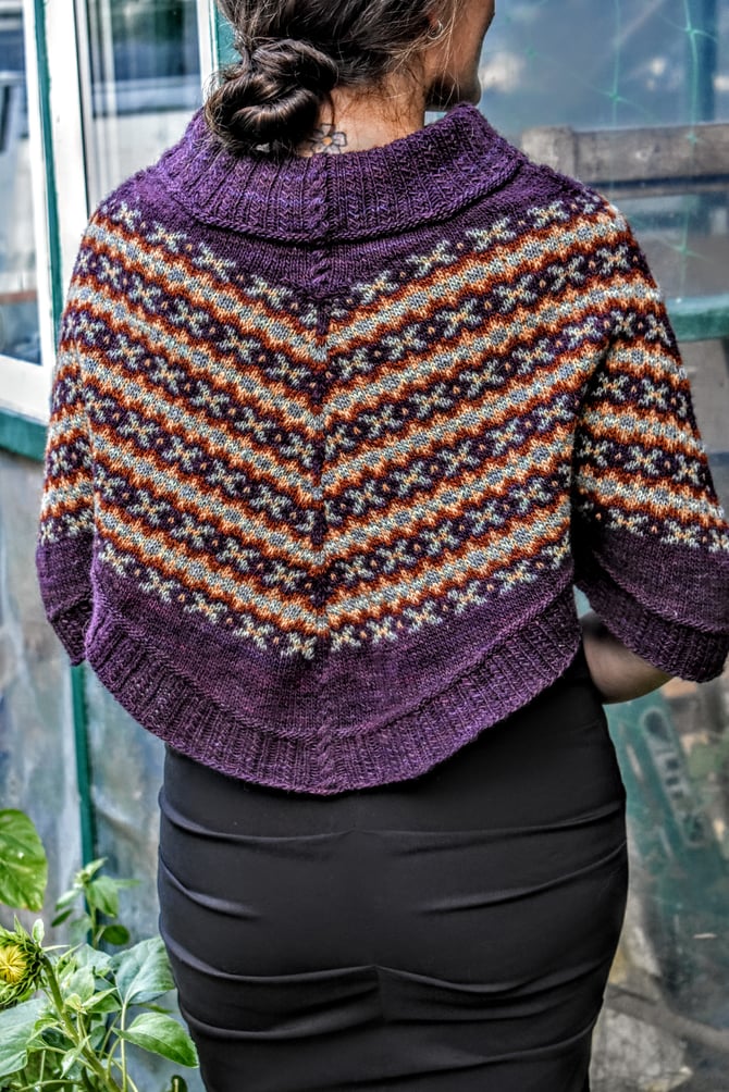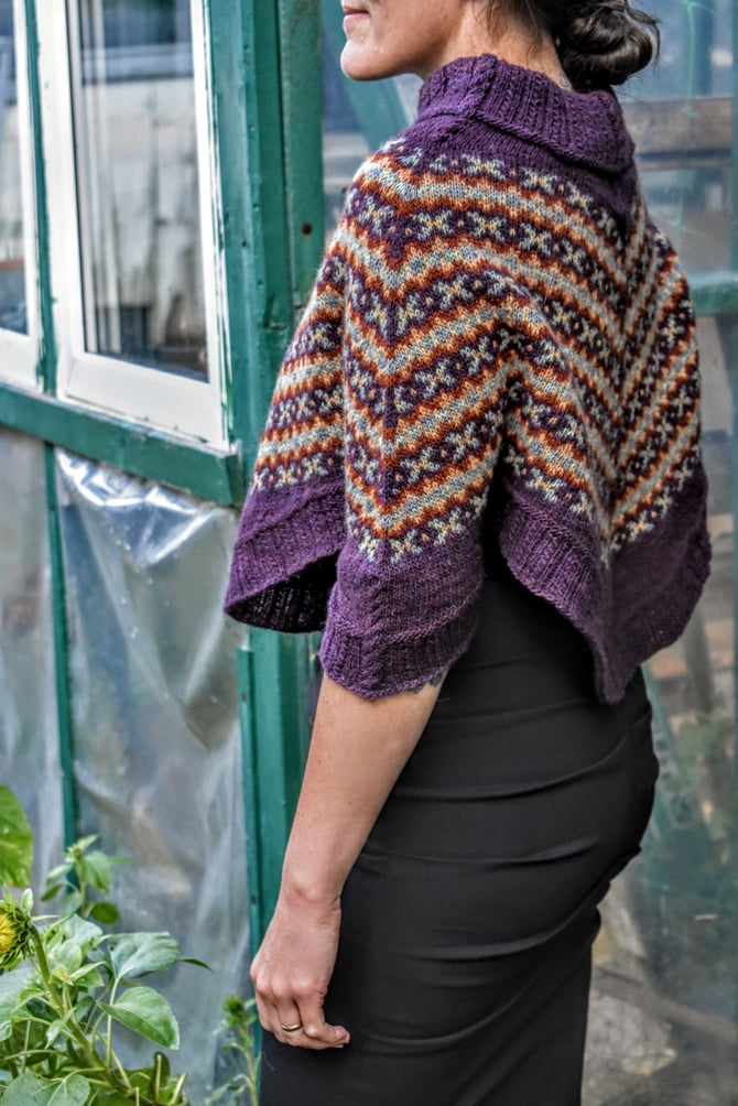 Corner Brook is a fun transition piece, winter to spring or summer to autumn. Top-down and in the round, the extra bit of shaping at the collar and hem enhances the geometry. You can opt to wear it as a swancho by creating faux sleeves in the end, or leave it fully open as a poncho.