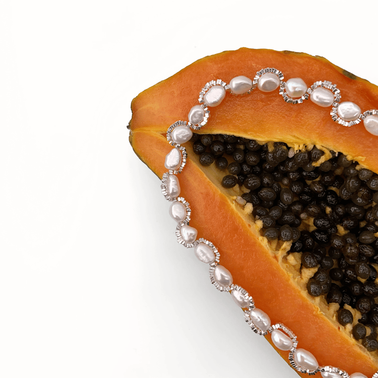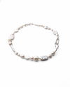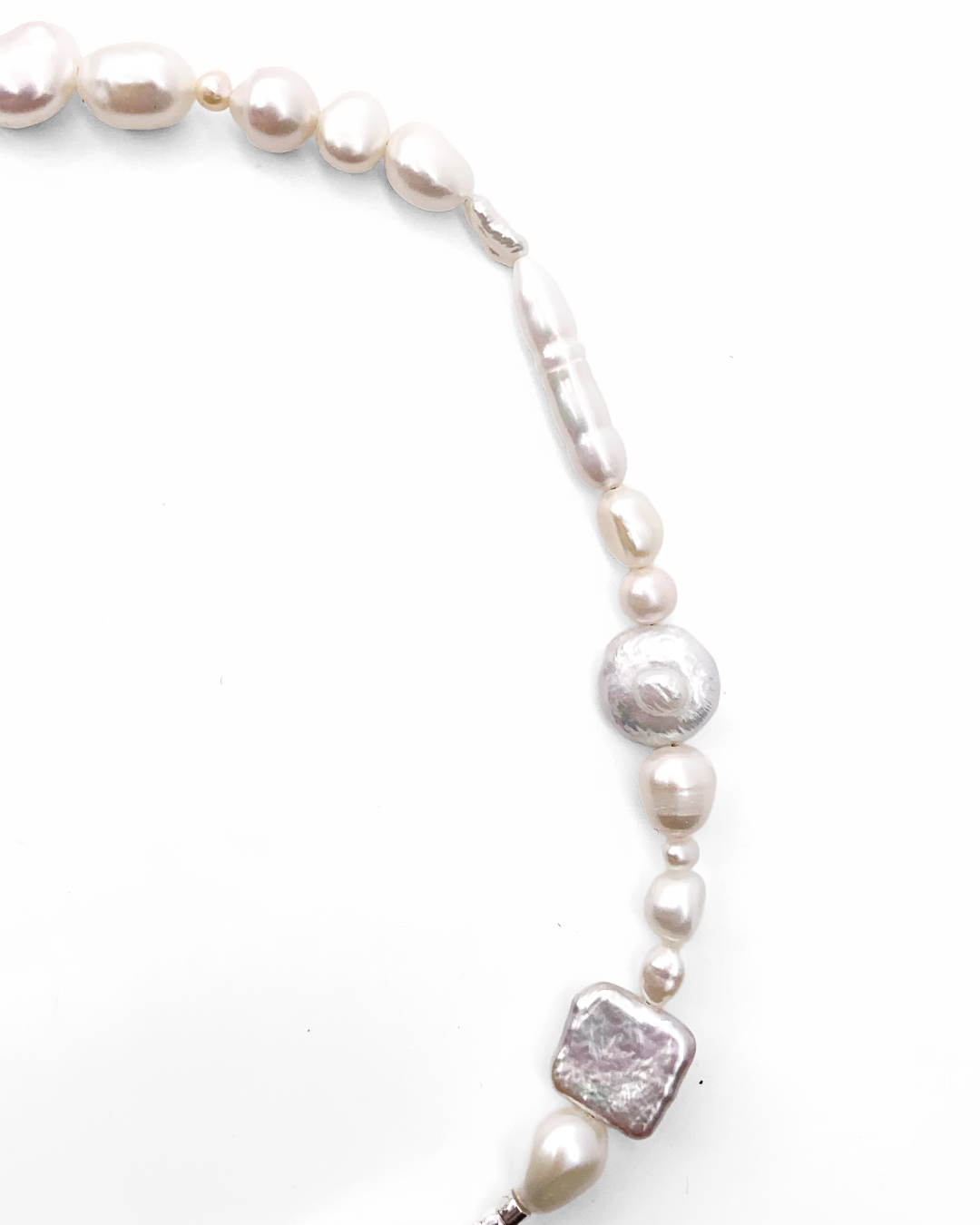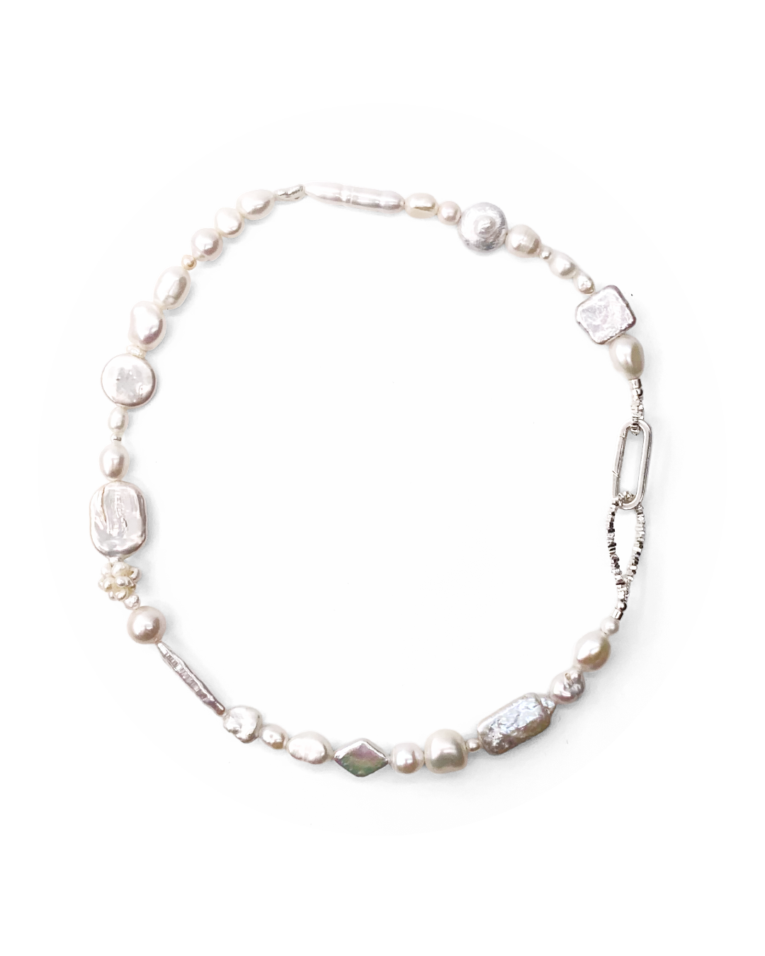 以不同大小、不同種類的珍珠逐一排列組合,搭配特別設計的碎銀扣環,保留自然的不規則,也保留時間的質感。每一條都獨一無二。