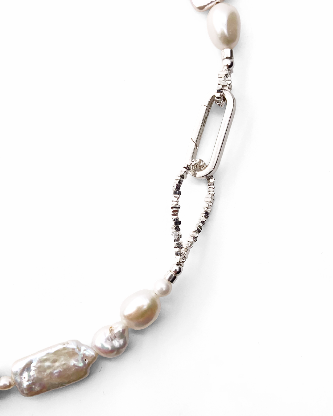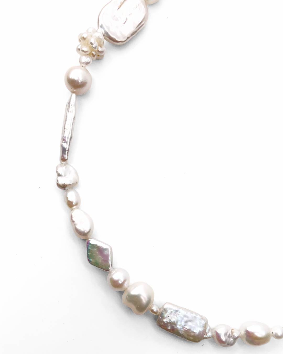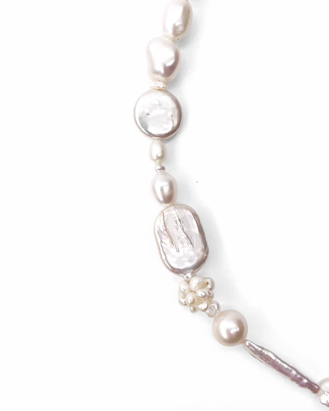 Composed of pearls in varying sizes and types, carefully arranged and finished with a specially designed fragmented silver clasp. Natural irregularity is preserved, and each piece stands uniquely on its own.