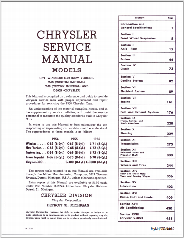 1956 Chrysler C-71 Windsor C-72 New Yorker C-300B Chrysler C-73 Imperial C-70 Crown Imperial Service Manual Part No. D-15724