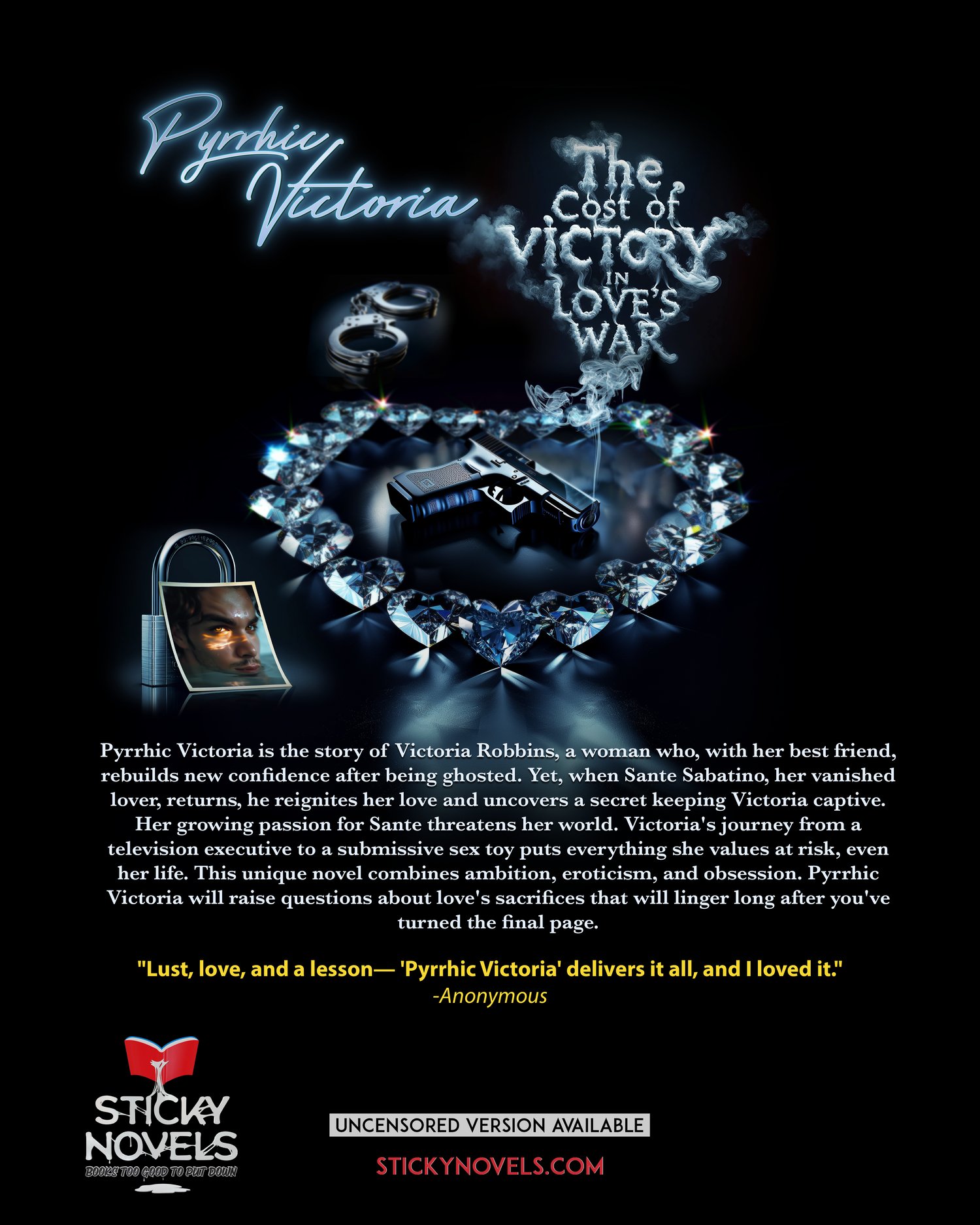 Victoria Robbins thought she’d moved on—until Sante, her mysterious former lover, reappears, drawing her into an intense world of forbidden desires and submission. As passion and ambition collide, Victoria risks everything she’s built for a love that tests her limits. In Pyrrhic Victoria, literary erotica and psychological suspense blend in a provocative journey of identity, obsession, and self-discovery. Will Victoria emerge victorious, and if so, at what cost?