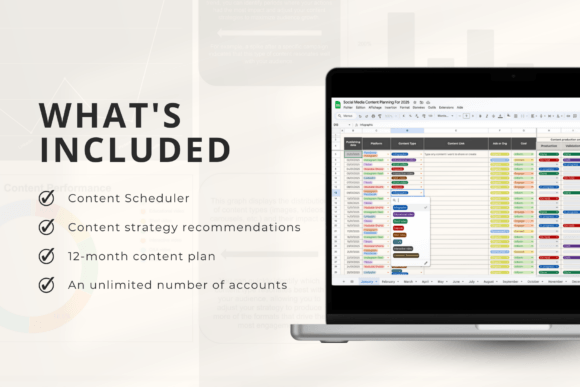 Each month, it offers content-type ideas for platforms like Facebook, Instagram, LinkedIn, Pinterest, YouTube, and TikTok. You can embed images, text, and links directly into the planner. For social media managers, the calendar includes KPI growth tracking columns to follow engagement across multiple accounts.