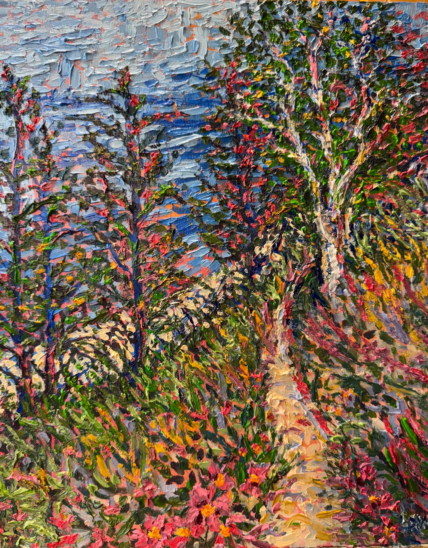 A lively impressionism work based on a hike high up in the dunes overlooking Lake Michigan. Native small roses bloom along the trail lined with cedar and birch trees.