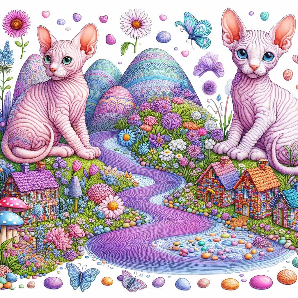 Two Sphynx cats beside a purple lake, with colourful hills & flowers.