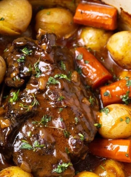 Classic pot roast cooked low and slow until fork-tender, served with buttery herb roasted potatoes and brown sugar glazed carrots.