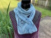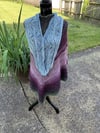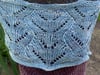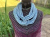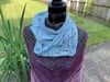 Any fingering weight yarn will work with this as long as your gauge (yarn/needle combination) creates a fabric that will drape nicely around your neck. This pattern will work well with any gradient, solid, or semisolid colors. The sample was knit with Soft n’Shiny Twilight in Lady Sybil’s Dress. (fingering weight, grams, 439 yards) and used 307 yards