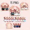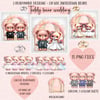 Teddy bear wedding couple, 3 readymade designs plus bride, groom & accessories. 8 brides, 3 grooms, 2 dresses in 4 colours, 3 suit colours, Background. Sublimation, print