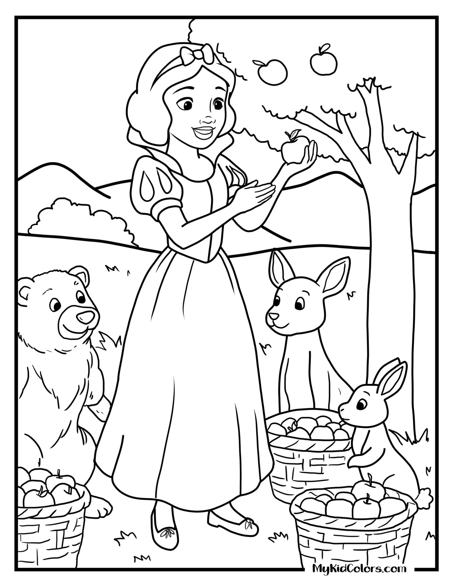 - Classic Characters & Beloved Elements: Pages include scenes with Snow White, the dwarfs, forest animals like deer, squirrels, and bears, as well as beautiful images of apples.