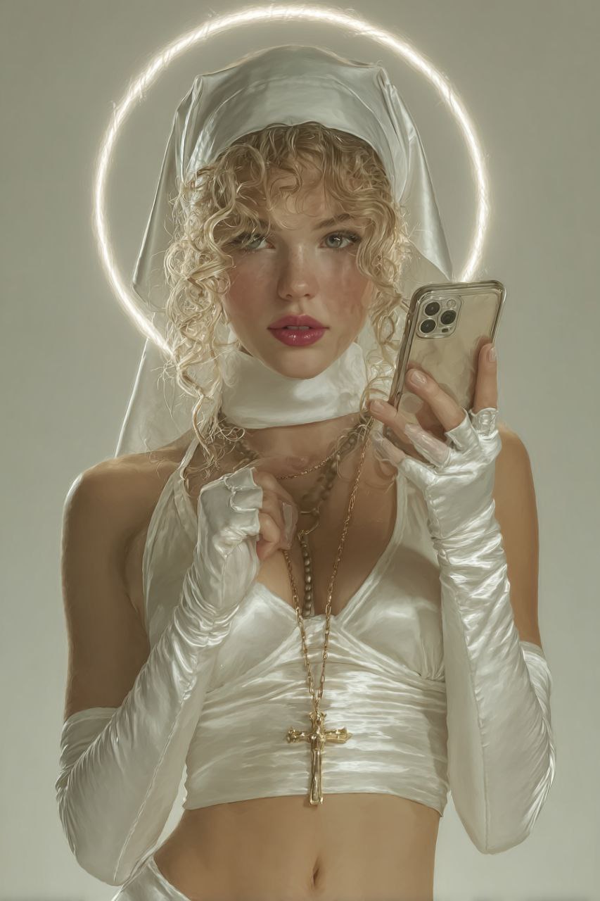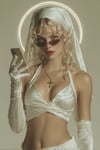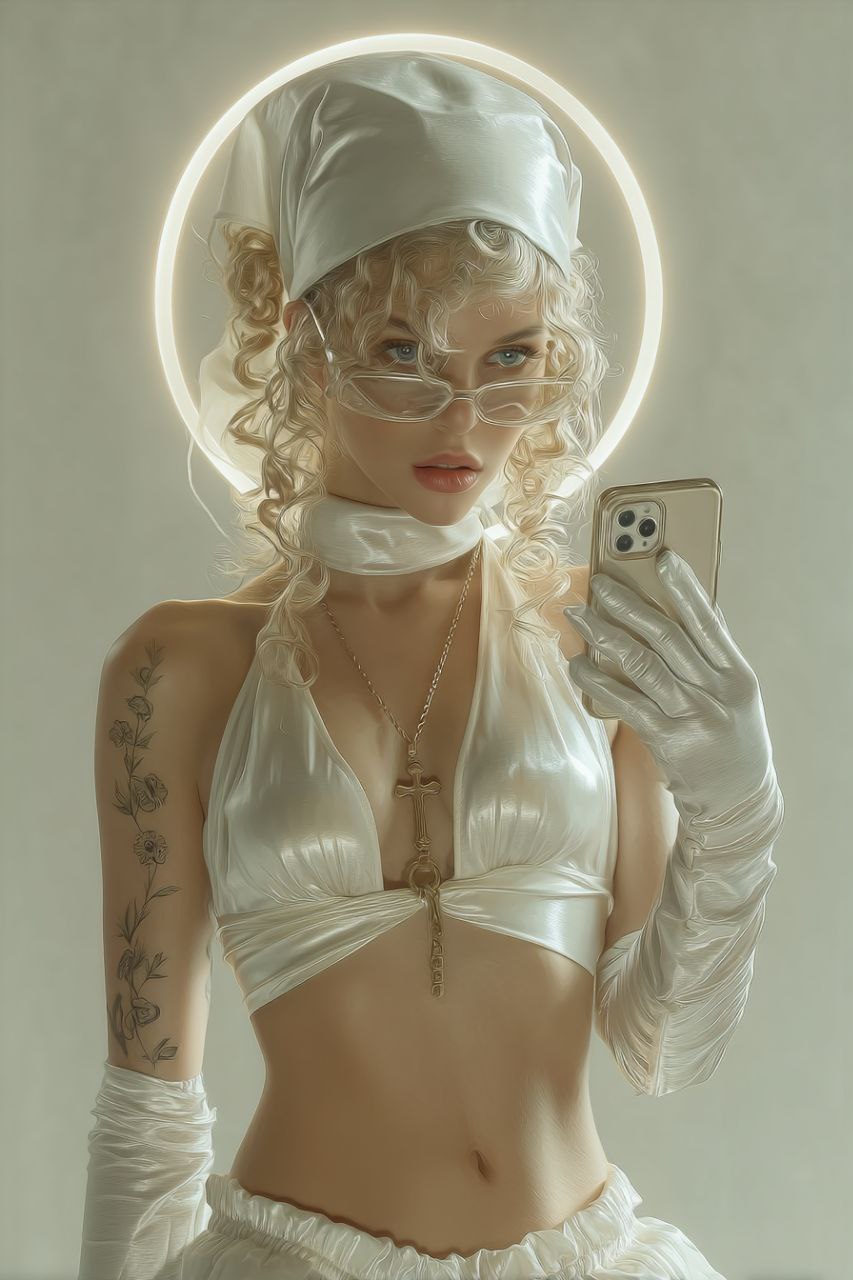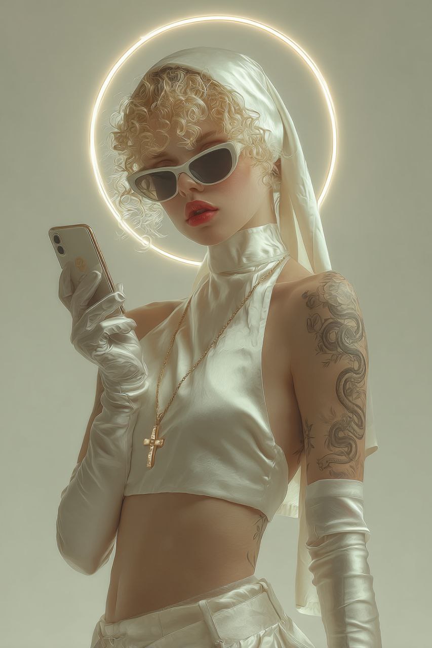 Generate ultra-photorealistic, high-fashion digital portraits with a Y2K aesthetic. This prompt creates a trendy young woman with blonde curls under a silk bandana, wearing a provocative religious-inspired outfit, elegant fine-line tattoos, dark sunglasses, glossy red lips, and a glowing neon halo. Perfect for editorial visuals, fashion campaigns, or stylized character art. Rendered in 8K with soft studio lighting, monochromatic white/cream palette, and gold accents for a striking, luxurious finish. Keywords: high-fashion, digital portrait, Y2K aesthetic, rebellious nun, neon halo, photorealistic, editorial, ultra-detailed, AI art.