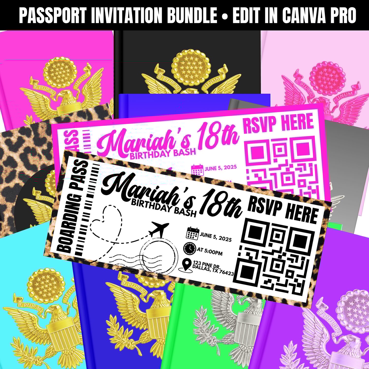 Each passport folds like a booklet (finished size: 3.5" x 5") and includes a coordinating boarding pass insert (7.5" x 3"). Personalize each design in Canva Pro by changing the colors, fonts, photos, and wording to match your event theme.